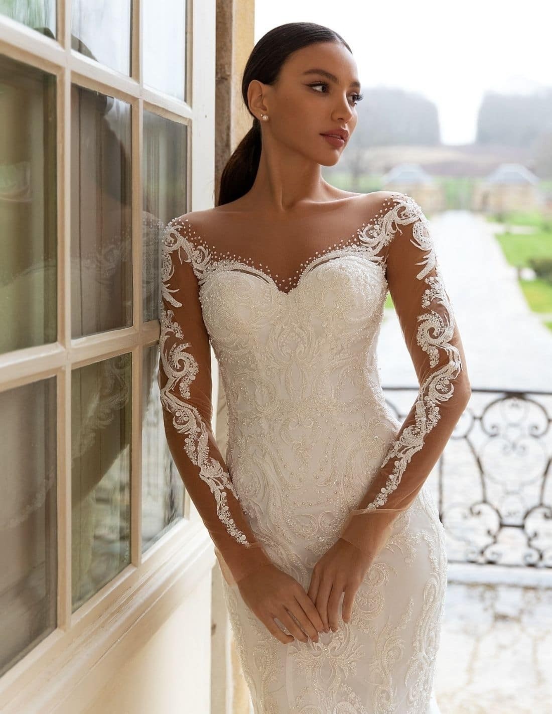 Cette robe de mariée brodée est la définition même de l'élégance et de la sophistication. Conçue pour mettre en valeur la silhouette féminine, elle présente un décolleté en cœur qui souligne délicatement le buste, complété par des manches effet tatouage brodées de strass et d'appliqués floraux qui ajoutent une touche romantique et exclusive.