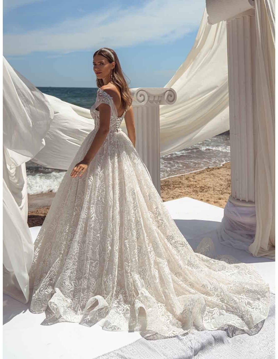 Spectaculaire robe de mariée en guipure luxueuse au design délicat inspiré de la nature. Le corsage corseté est incrusté de petits cristaux swarovski.