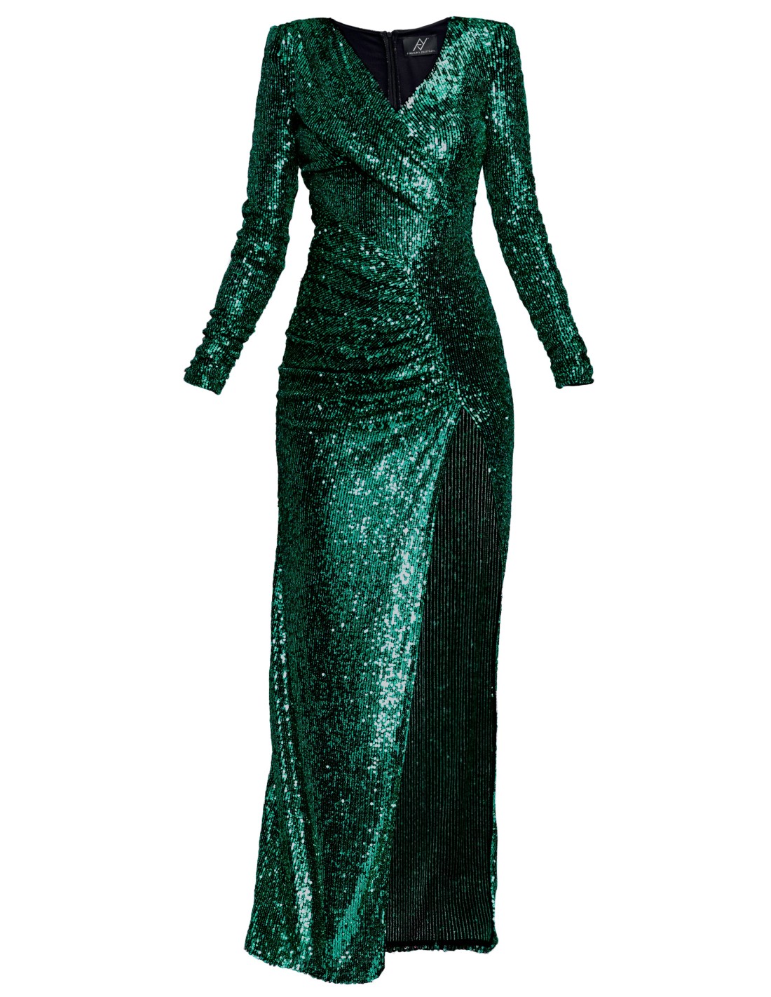 Cette éblouissante robe longue fendue à paillettes vertes est parfaite pour les invités qui veulent impressionner lors d'un événement formel ou d'une soirée de gala. Confectionnée dans un tissu à paillettes chatoyant qui scintille à la lumière, cette robe allie glamour et élégance de manière spectaculaire.