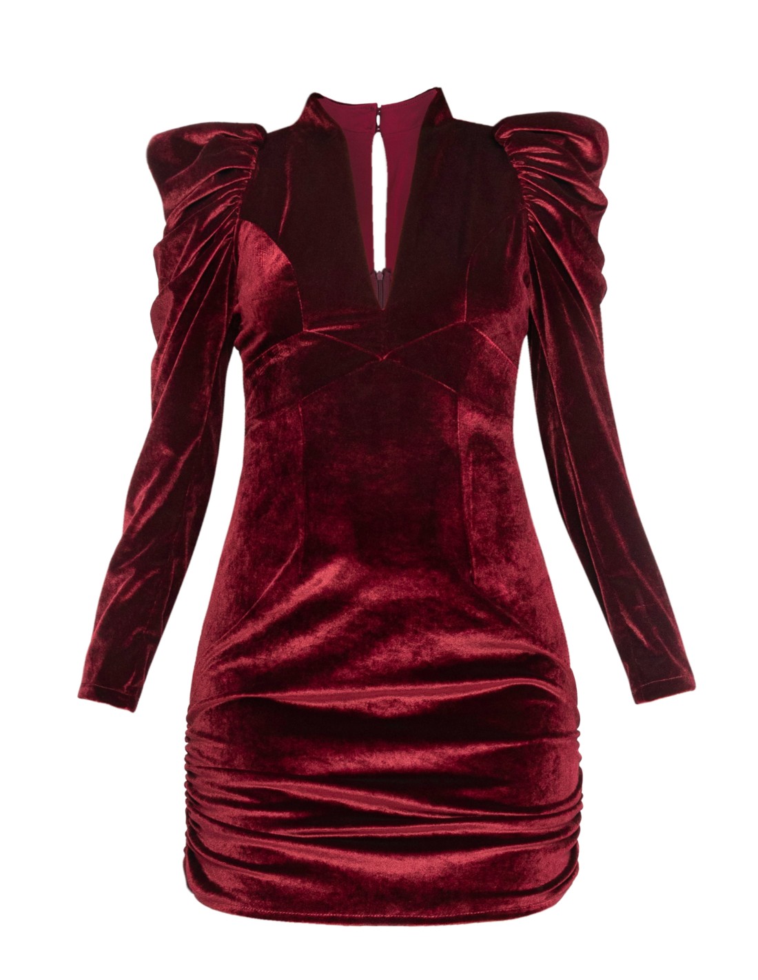 Elle présente un décolleté en V plongeant qui allie audace et raffinement, idéal pour les événements formels. Les longues manches bouffantes ajoutent une touche de drame et de tendance, en donnant du volume et du style à l'ensemble. La silhouette ajustée met en valeur la silhouette, tandis que le drapé de la mini-jupe ajoute de la texture et du dynamisme, rendant cette robe flatteuse pour toutes les morphologies.