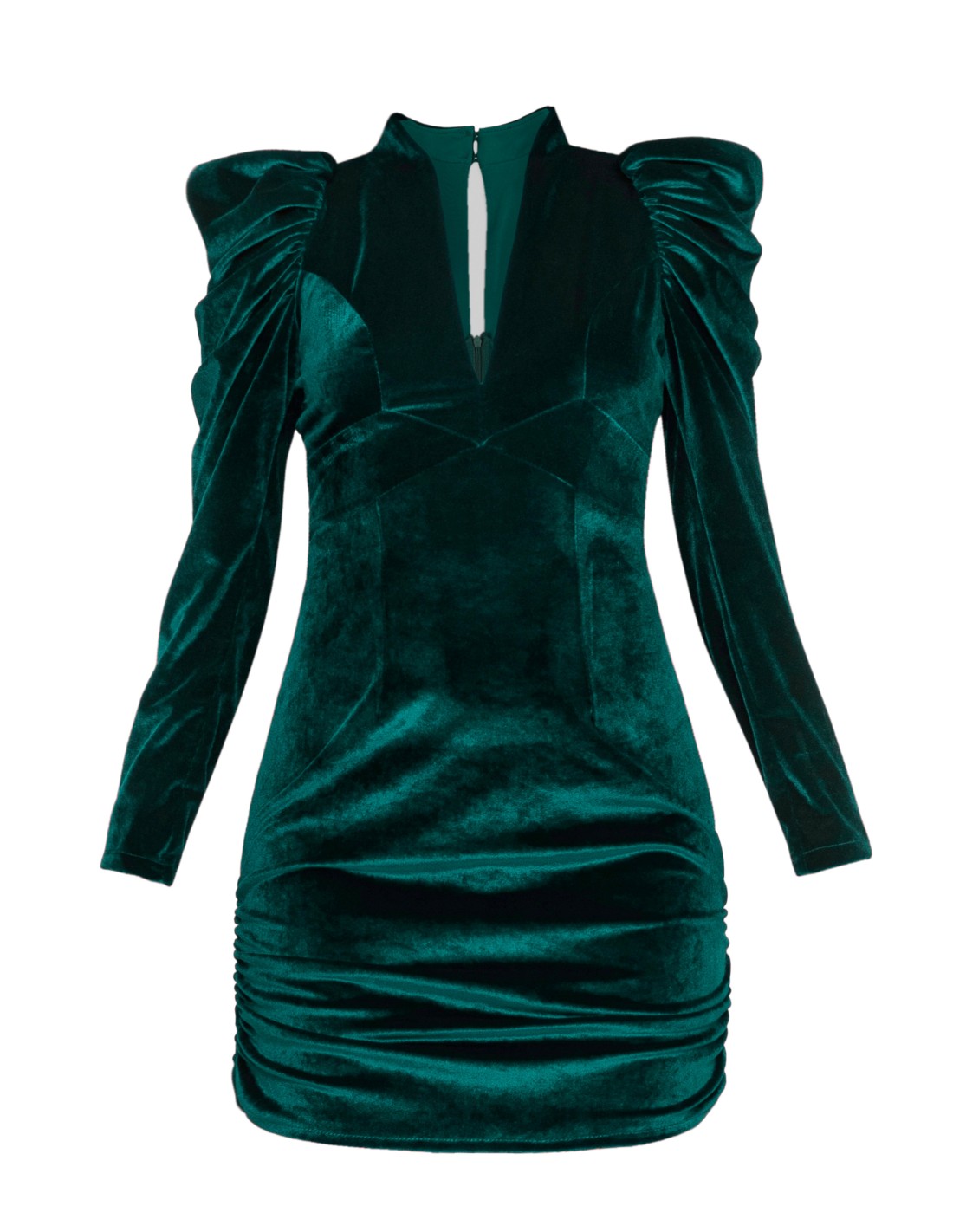 Cette superbe mini robe en velours vert émeraude est le choix idéal pour les invités qui souhaitent se démarquer lors d'un événement spécial. Confectionnée dans un velours luxueux qui reflète la douceur et la brillance, cette création élégante et moderne attire l'attention grâce à sa finition unique et à ses détails soigneusement élaborés.