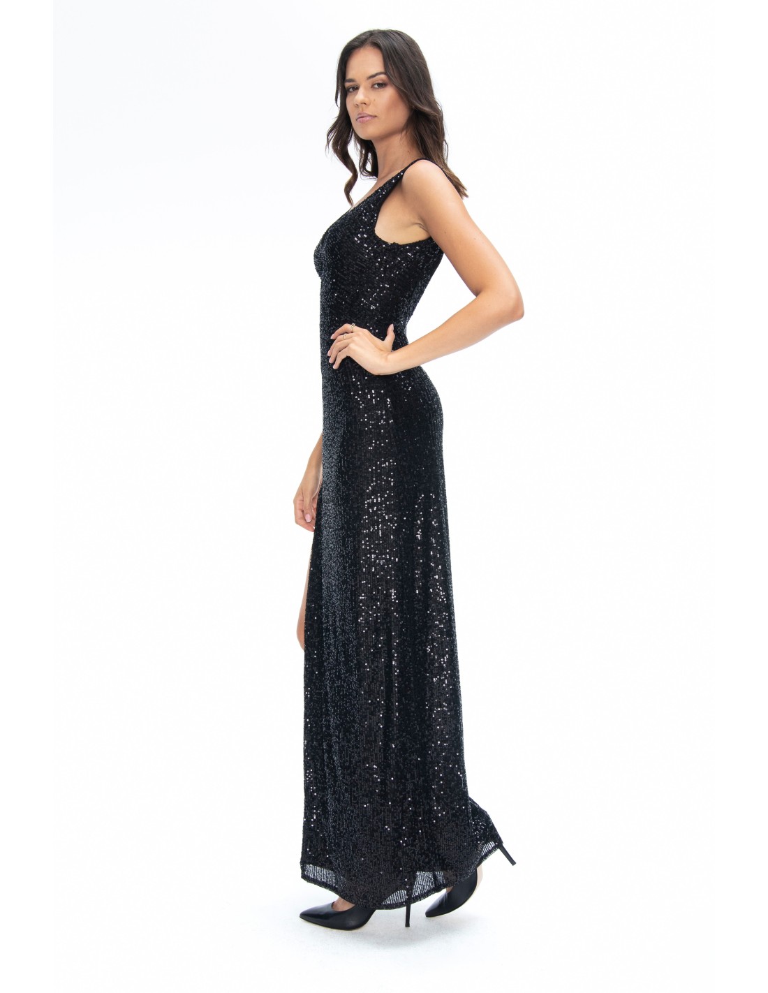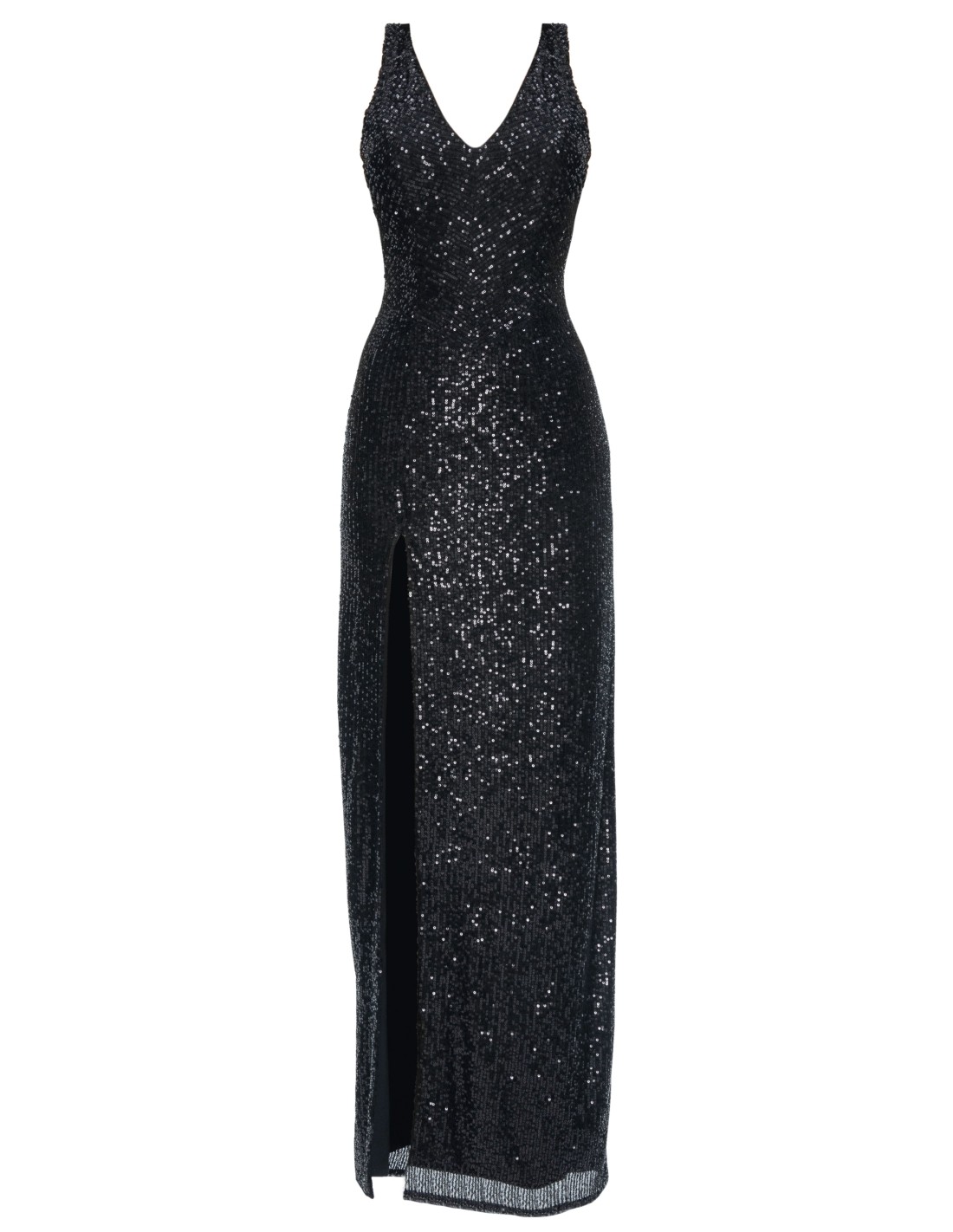 Robe noire moulante à sequins avec fente au niveau des jambes, décolleté en V et dos ouvert