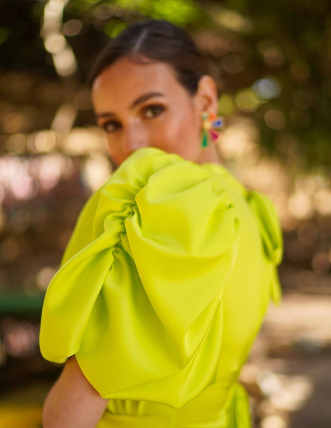 Cette robe de soirée midi est présentée dans une maille flatteuse dans une couleur citron vert frappante qui est parfaite pour la saison printemps-été. Elle est dotée de manches courtes bouffantes et d'un col perkins avec des fronces sur le dessus.