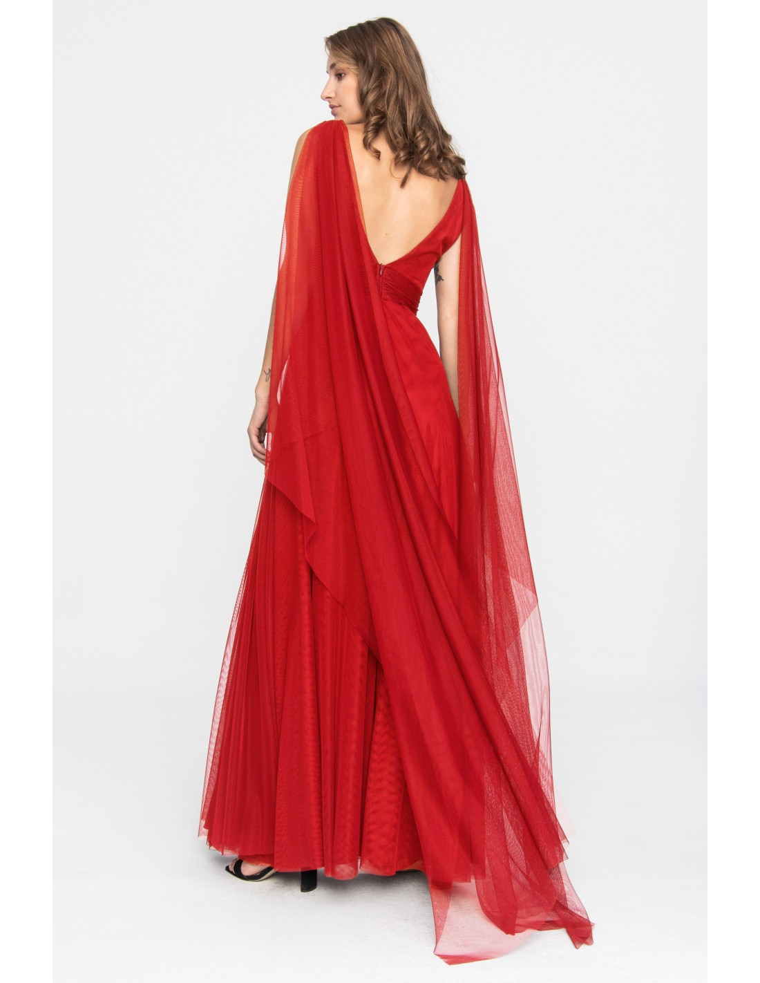 Longue robe de tulle rouge avec décolleté en V et fente sur le côté