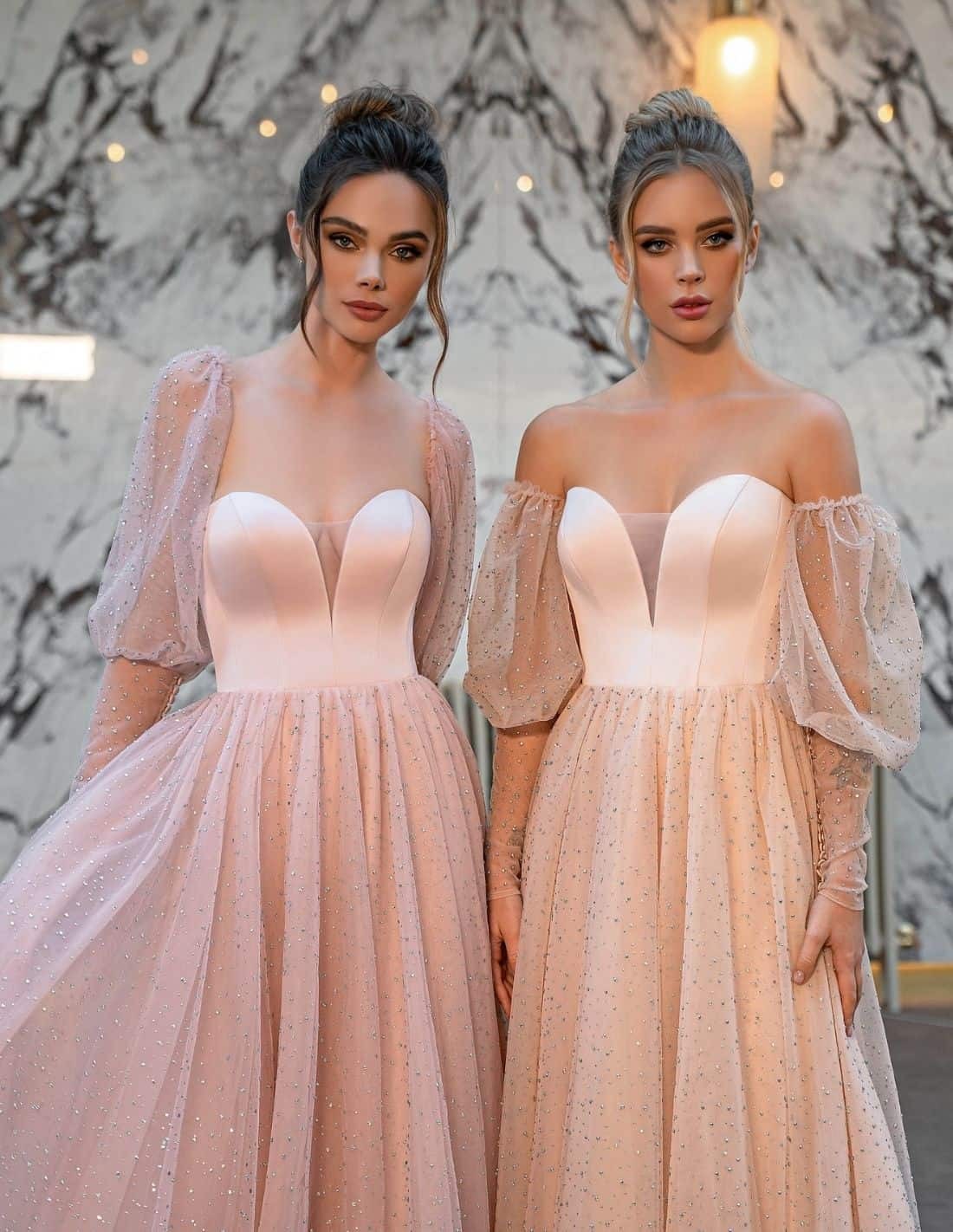 Cette robe d'invitée est confectionnée dans un tulle délicat orné de pierres disponibles en rose ou en nude. Elle présente un décolleté en cœur avec un corset et des manches gigot avec des boutons recouverts. Sur la Jupe il y a un nœud en satin et sur le dos il y a un nœud de style corset avec fermeture éclair invisible.