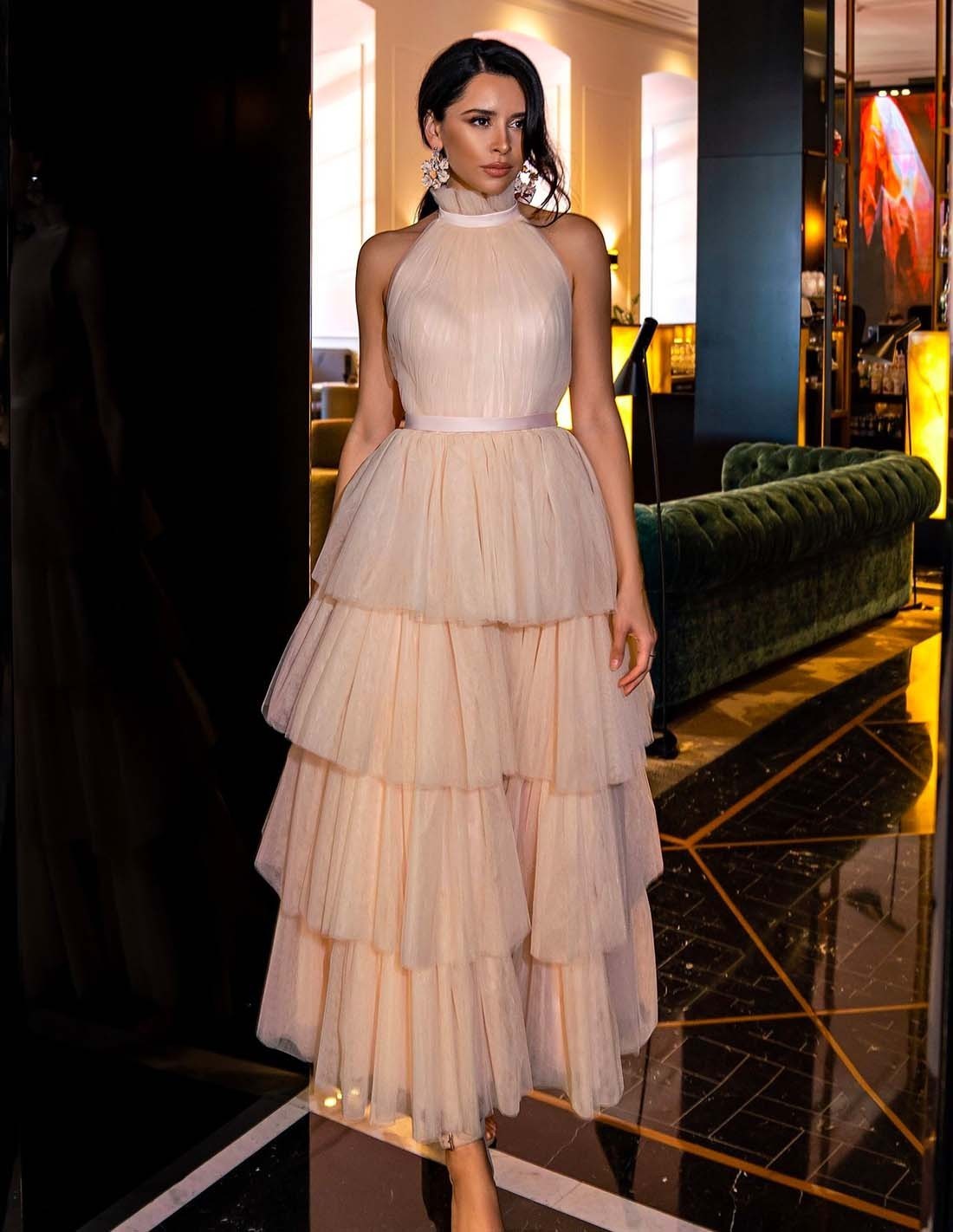 Robe de soirée midi à col licou avec jupe en tulle superposé pour les événements spéciaux.