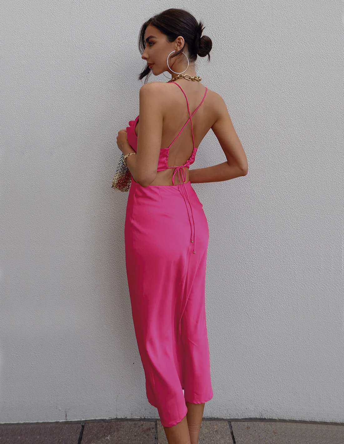 Robe de soirée midi en satin d'une superbe couleur rose fuchsia, avec dos ouvert et fermé par un nœud.