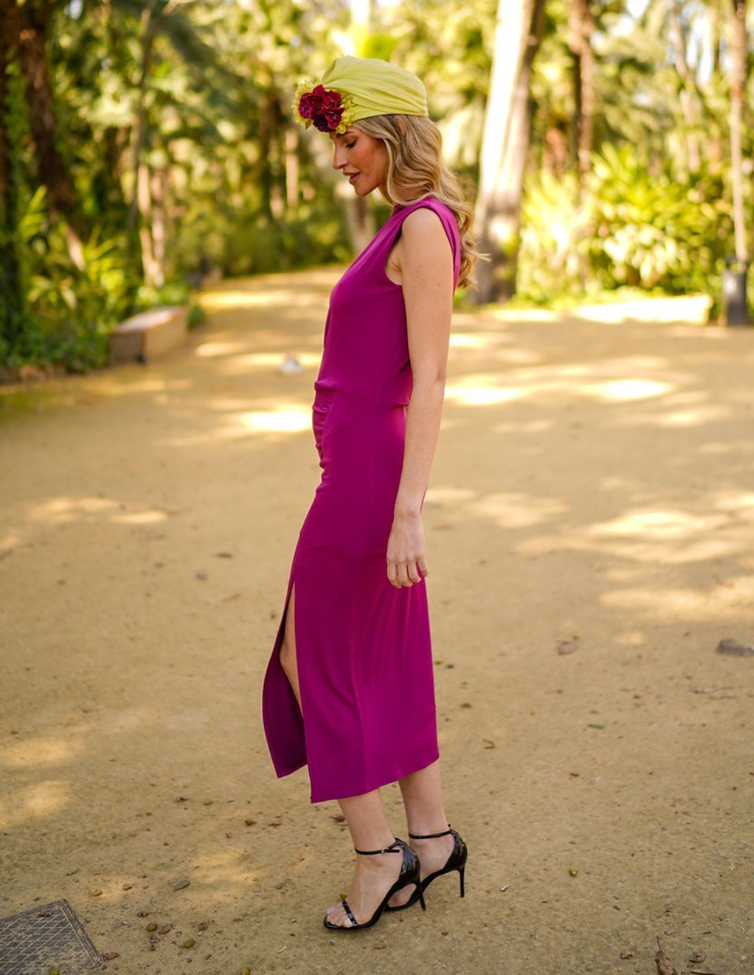 Robe de soirée midi aubergine avec fente latérale pour les occasions spéciales.