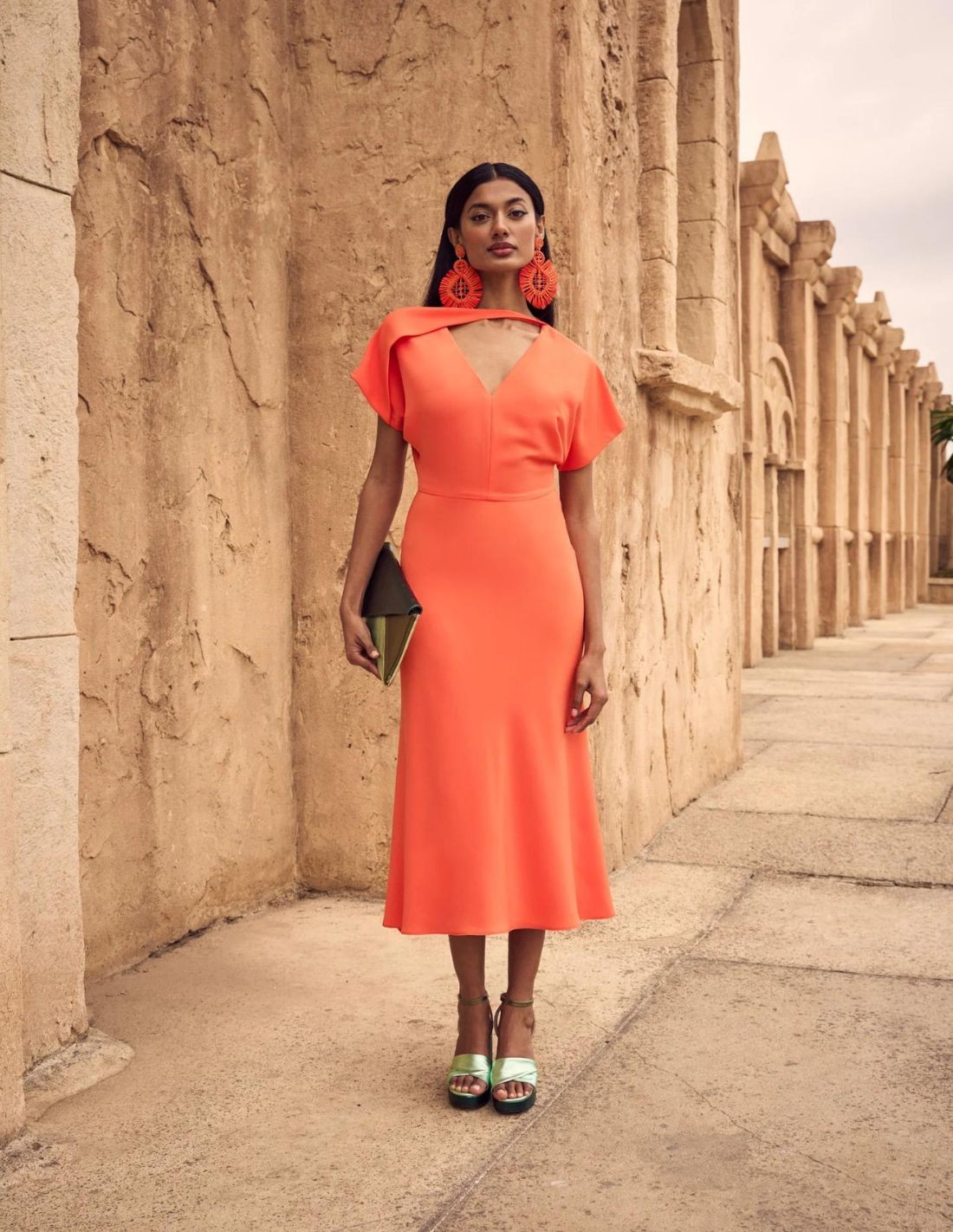 Robe de fête midi avec encolure asymétrique et jupe fluide pour les invitées.