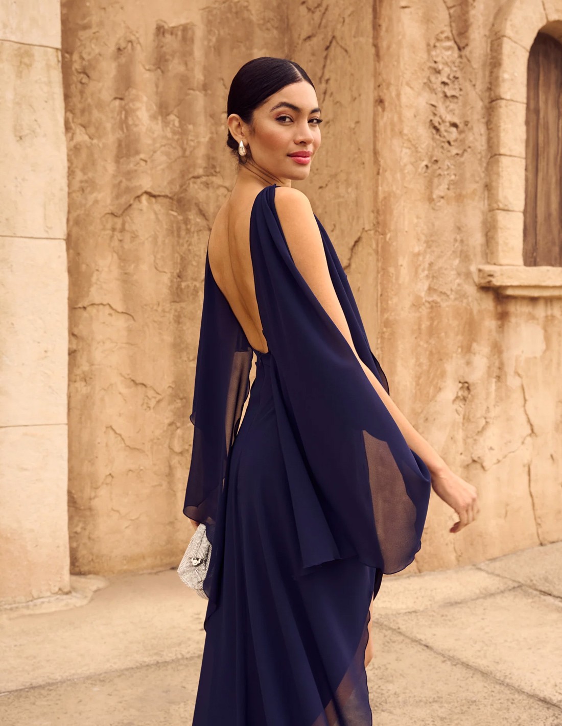 Robe de soirée midi avec dos ouvert et manches fluides en bleu marine.