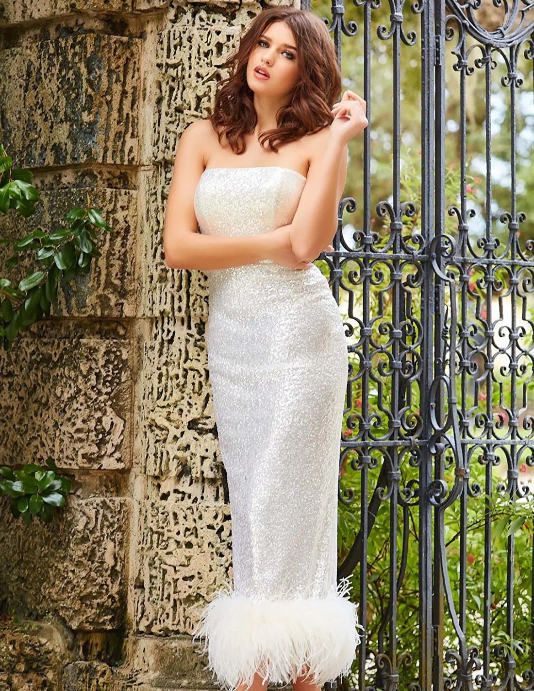 Une robe de soirée midi sans bretelles avec des sequins et des plumes pour les mariées et les invitées pour les mariages ou les événements spéciaux.