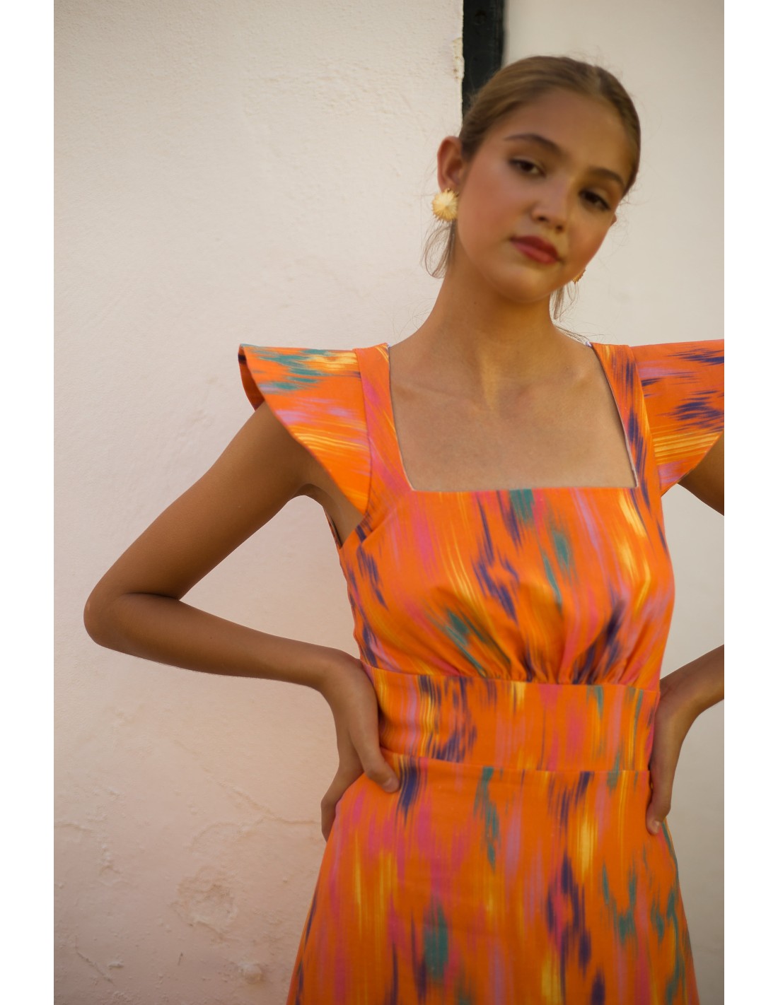 Cette robe d'invité midi en lin imprimé dans des tons orangés se distingue par son design féminin et sophistiqué. Elle présente une encolure carrée sur le devant et dans le dos pour un look contemporain et flatteur.