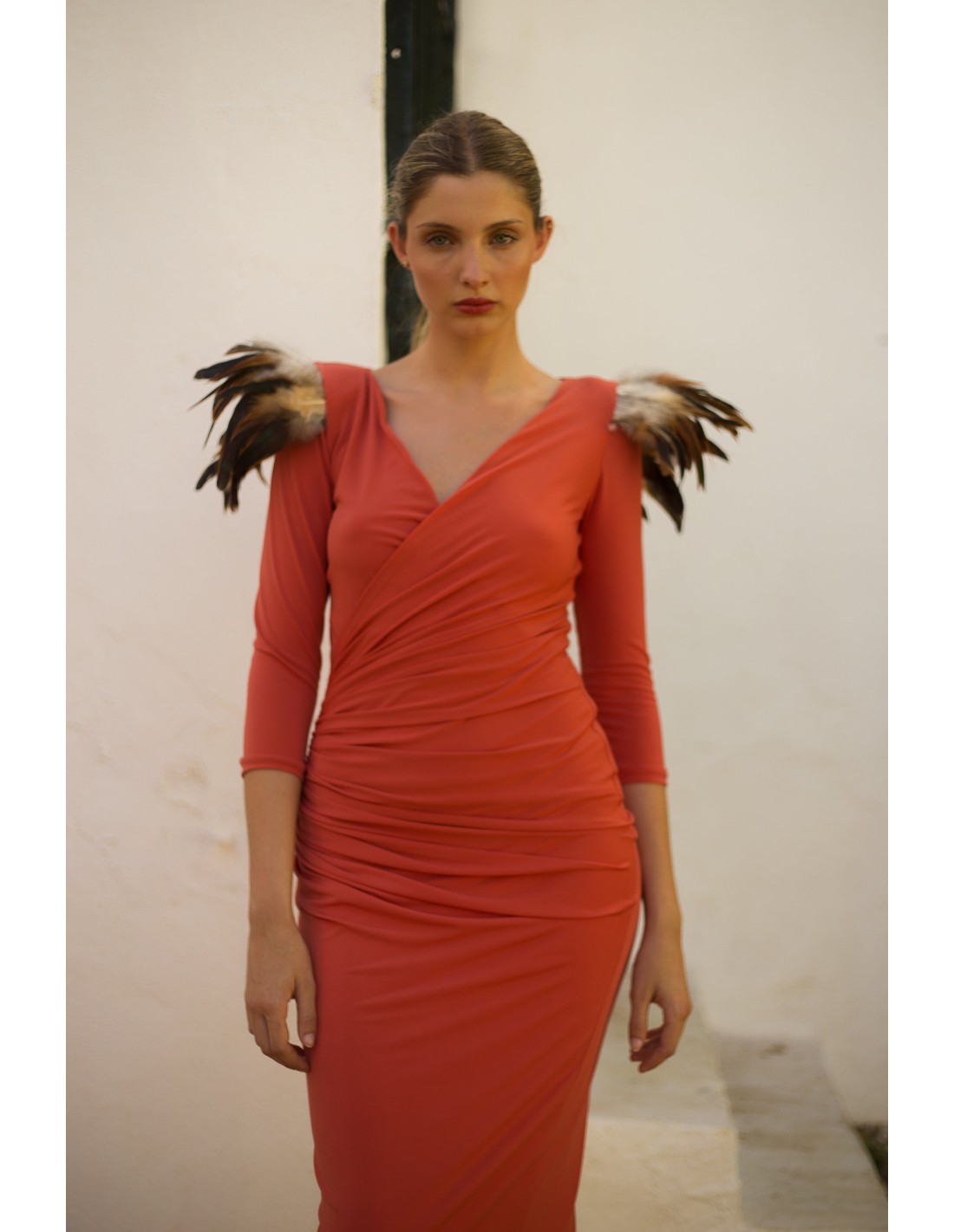 Robe midi avec encolure croisée et détails de plumes en roux.