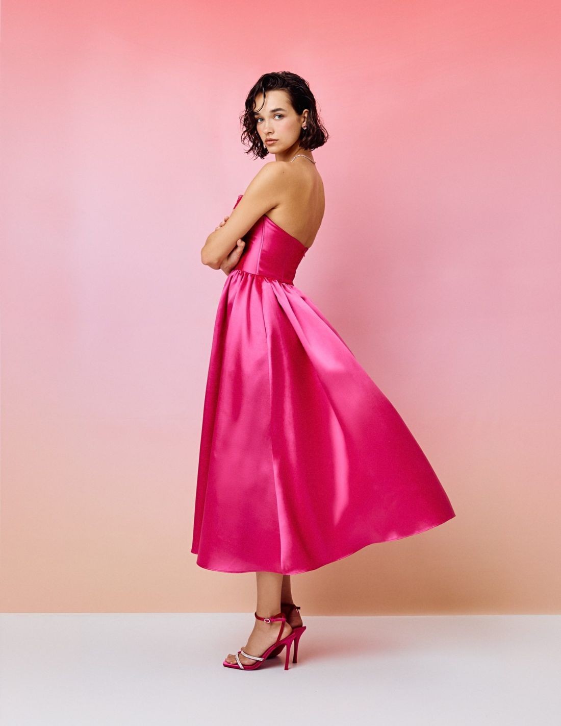 Cette robe de soirée midi en tissu mikado rose scintillant accrocheur est un modèle élégant qui ne passera pas inaperçu. Elle est conçue pour les invitées uniques qui veulent se démarquer lors de leur prochain événement de jour. Elle présente un décolleté sans bretelles et une jupe flottante.