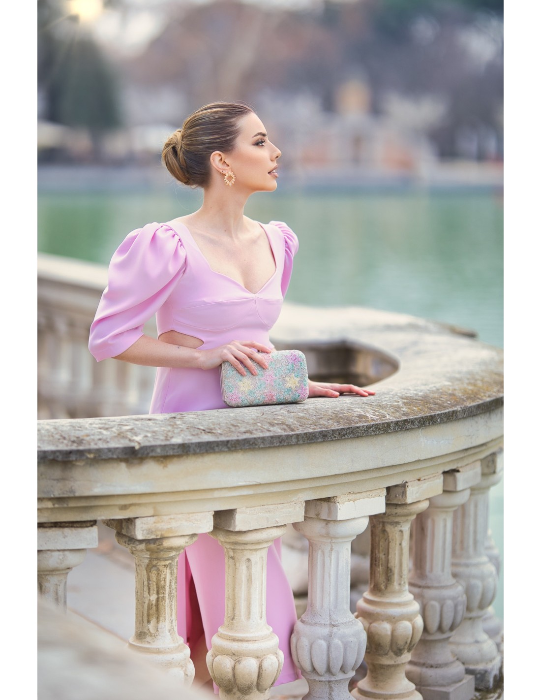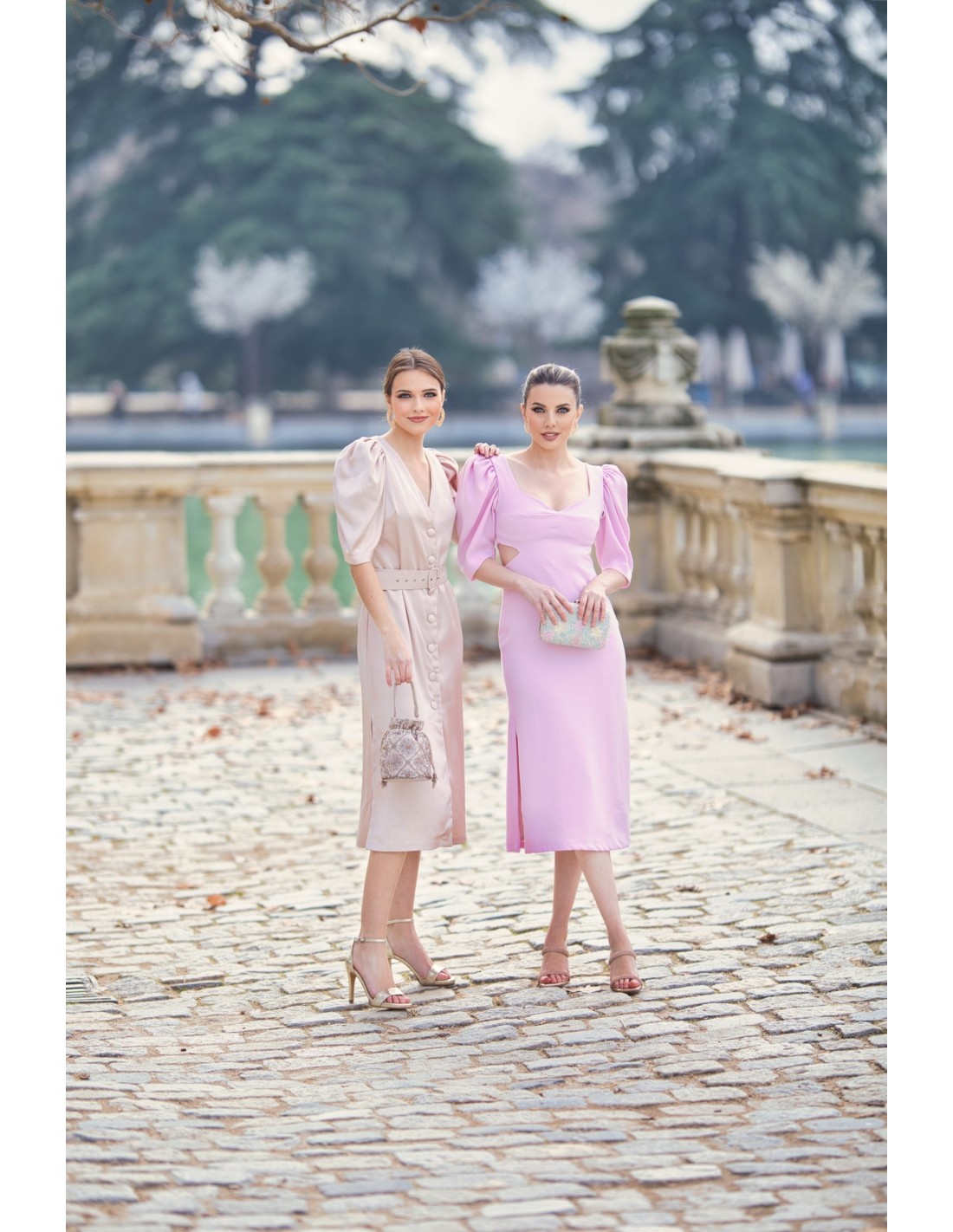 Robe d'invité midi avec découpe et maxi nœud en rose, idéale pour un événement de jour. Très élégante et sophistiquée, elle est dotée d'un nœud en organza que vous pouvez placer sur l'épaule. Elle possède également des manches amovibles qui vous permettent de créer différents looks pour différentes occasions. C'est une robe polyvalente qui vous mettra en valeur et vous fera briller. Conçue avec un décolleté en cœur et une découpe subtile sur les côtés. Doublure intérieure.