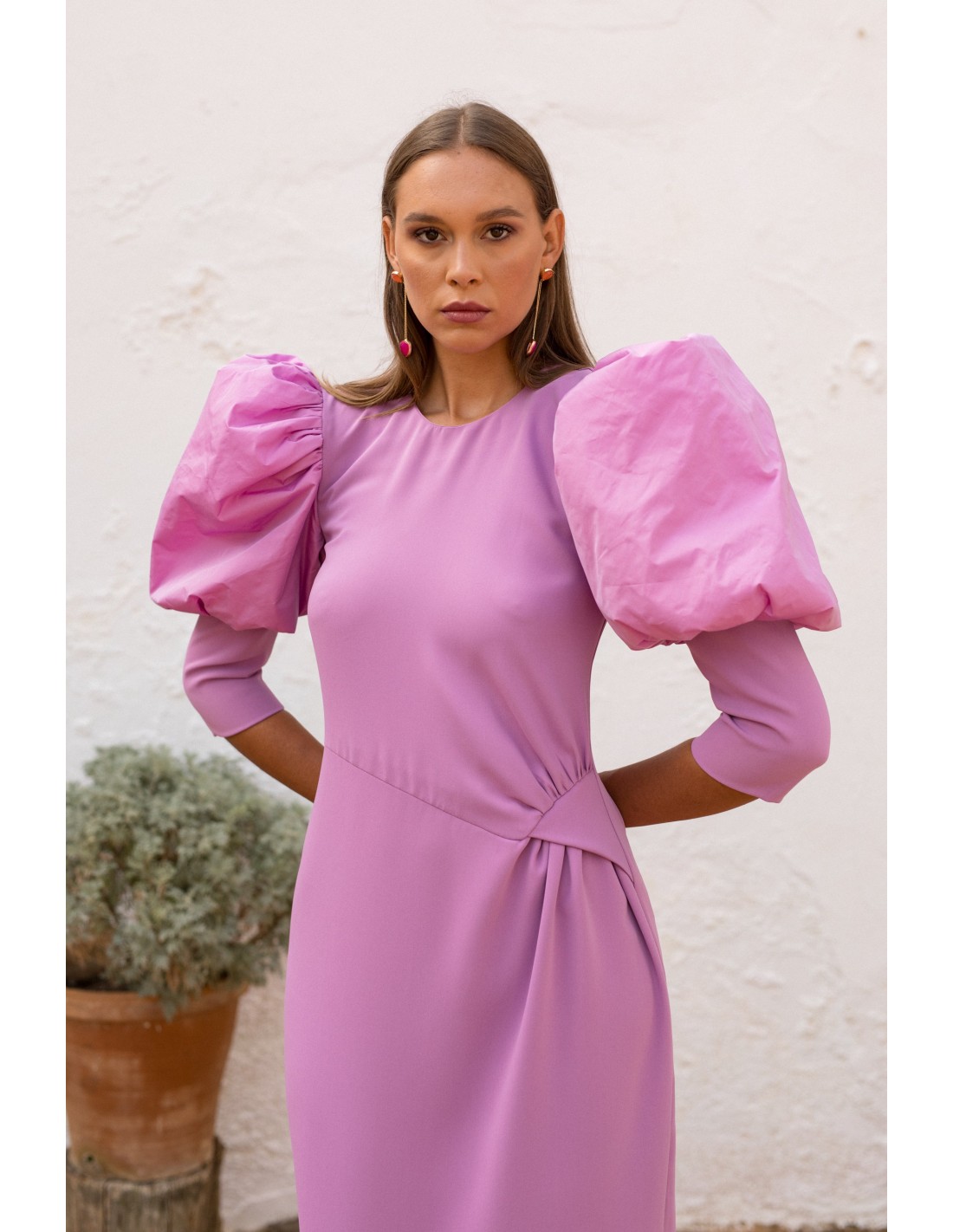 Cette robe de soirée midi lilas en crêpe fluide avec des détails en taffetas sur les manches est le choix idéal pour les événements spéciaux. Cette robe midi, pleine longueur, présente une encolure carrée et un corsage ample qui se ferme par un nœud latéral élégant pour un drapé fluide et sophistiqué.