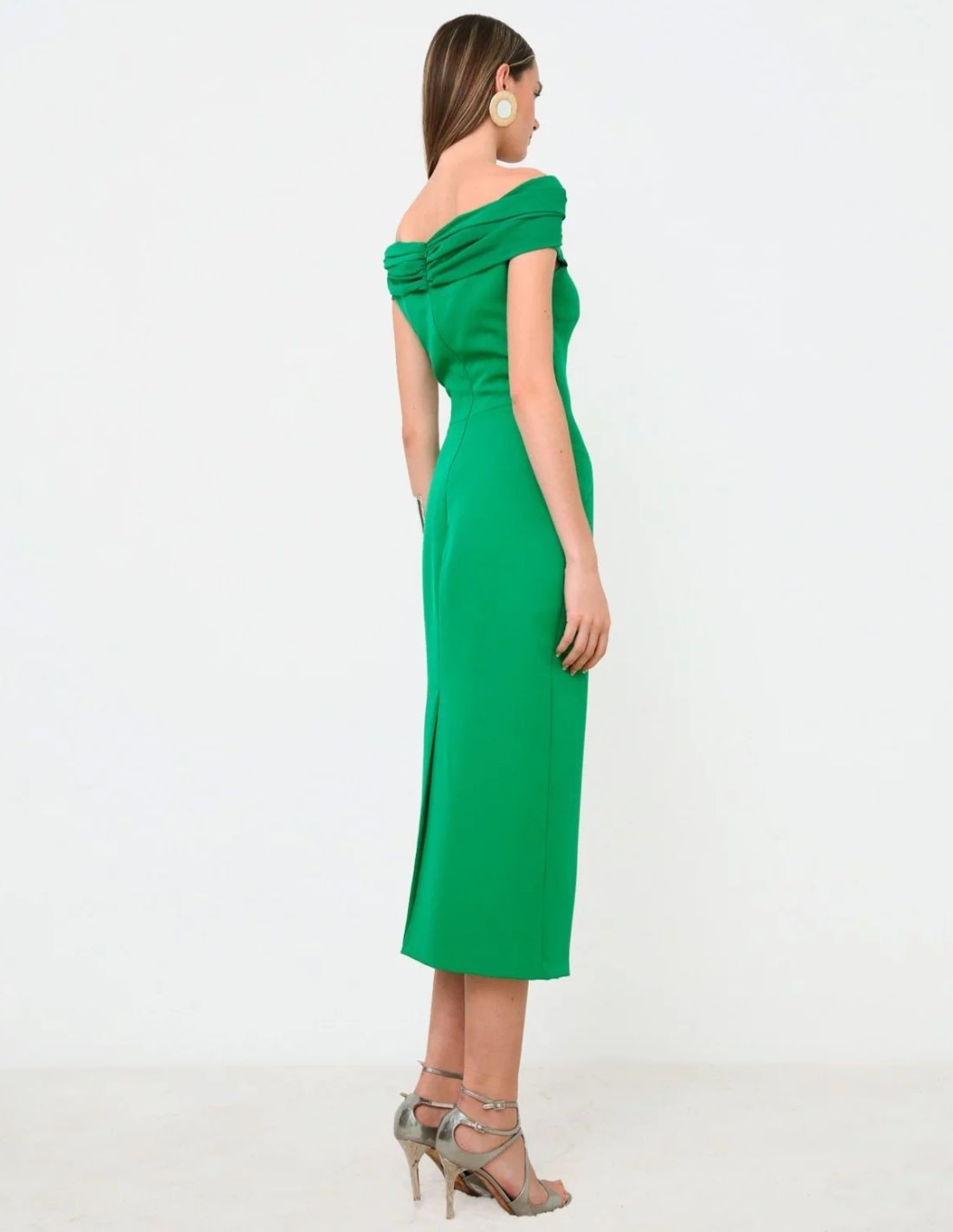 Robe de soirée midi verte avec encolure bandeau drapée