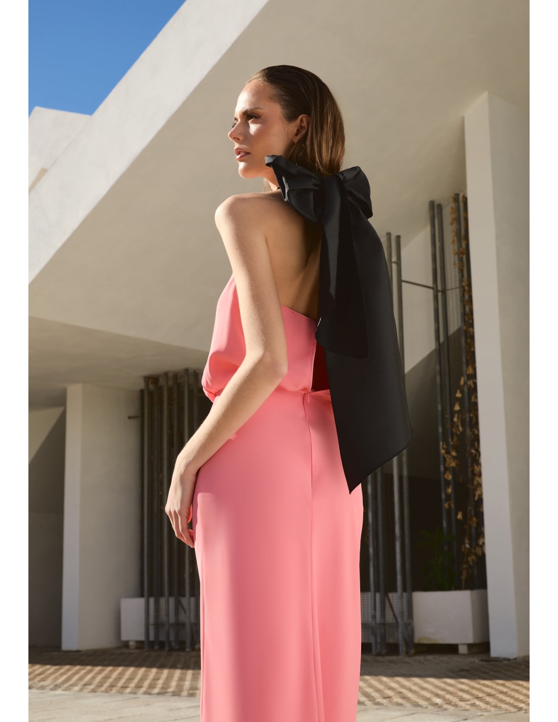 Cette robe midi d'invitée rose et noire est le choix idéal pour celles qui recherchent élégance et style en un seul look. Confectionnée en crêpe de haute qualité, elle présente une encolure dos nu nouée en taffetas qui forme un nœud sophistiqué dans le dos pour une touche originale et raffinée.