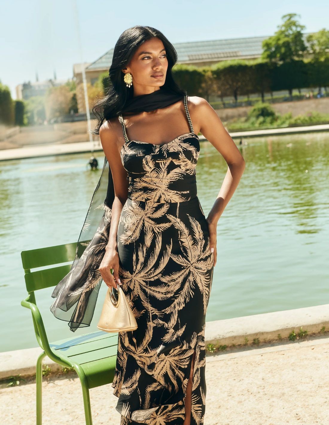 Si vous avez une soirée à organiser, cette robe d'invité sera celle qui vous fera briller. Fabriquée en satin noir avec imprimé palmier, elle présente un décolleté en forme de corset. Elle présente un décolleté en cœur de type corset, avec de fines bretelles en coton tressé terminées par une houppe décorative frangée. Elles lui confèrent une touche d'élégance et de modernité. Elle est accompagnée d'un châle en mousseline de soie multipositions imprimé du même motif, qui complète le look et ajoute de la distinction. Elle se distingue par sa jupe coupe midi très flatteuse avec trois volants superposés qui lui donnent un léger rebond.
