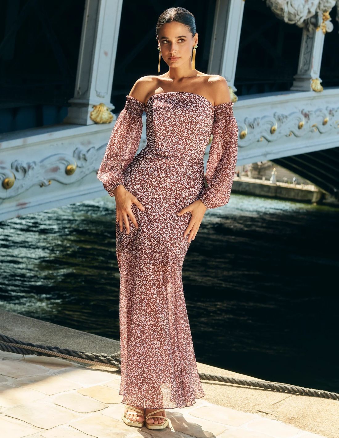 Robe midi imprimée bordeaux avec encolure sans bretelles pour les invités