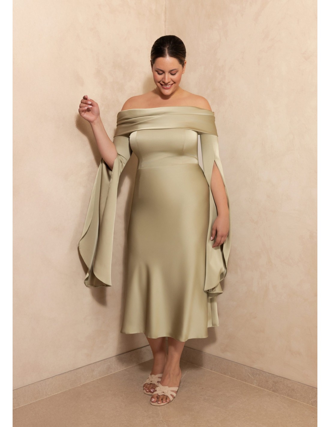 La robe midi à encolure bardot et manches plongeantes est la robe qui allie élégance, sensualité et confort en un seul modèle. Réalisée en satin de haute qualité, la matière fluide et lumineuse offre une finition sophistiquée, idéale pour mettre en valeur toute occasion spéciale. L'encolure bardot flatte le cou et les épaules de manière flatteuse, tandis que les manches tombantes ajoutent un air romantique et féminin à l'ensemble.