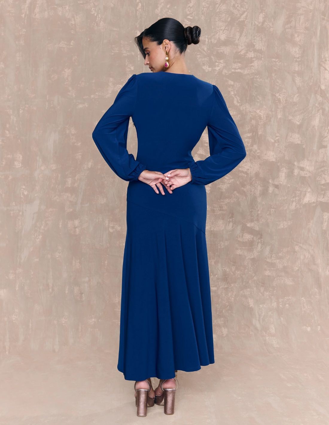 Si vous avez un événement à venir et que vous n'avez pas encore trouvé le look parfait pour votre invitée, cette robe pourrait être l'option idéale. Cette robe midi bleu marine est confectionnée dans une maille de soie douce et élastique, qui confère un tombé fluide à la jupe asymétrique. Les longues manches bouffantes, terminées par un élastique aux poignets, ajoutent du volume au vêtement. Elle est dotée d'une fermeture éclair invisible sur le côté. Parfait pour les mariages et les remises de diplômes.