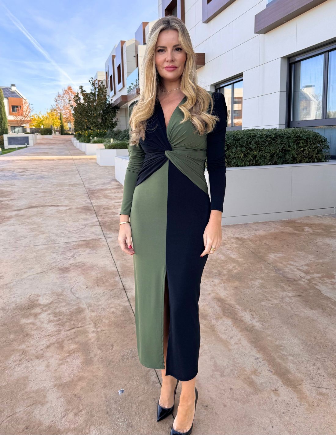 Cette robe midi au design bicolore vert chasse et noir, avec un nœud à l'encolure et une petite ouverture centrale dans la jupe, sera le look idéal pour vos prochaines occasions spéciales si vous êtes de celles qui recherchent l'élégance et le confort dans un même look. Associez-la à des accessoires noirs et dorés. Idéale pour les occasions formelles et informelles, et même pour les fêtes de Noël.