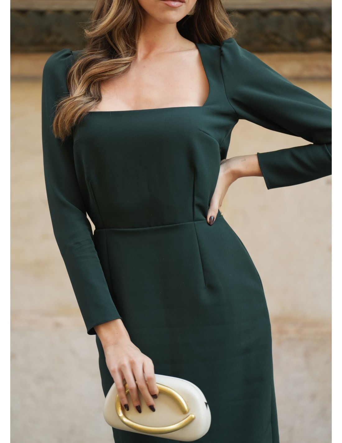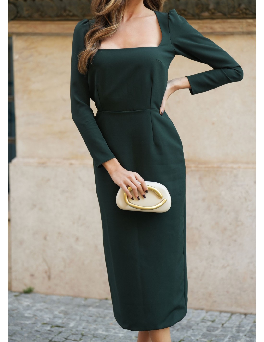 Robe midi vert foncé avec encolure carrée et manches longues élégantes