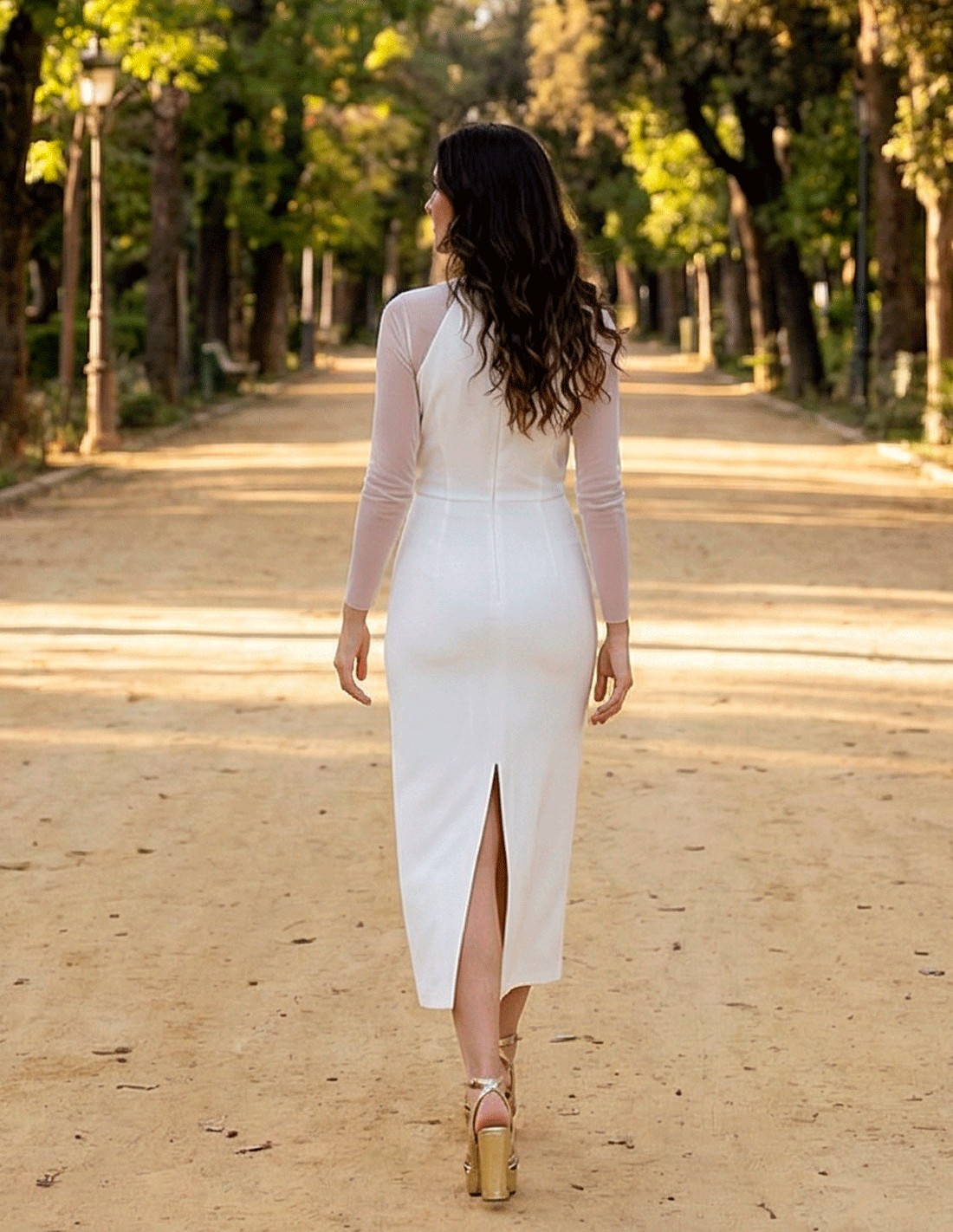 Robe d'invité midi blanche avec encolure croisée et manches en tulle, parfaite pour les mamans de communion ou de baptême, ainsi que pour les robes de mariée et de pré-mariage