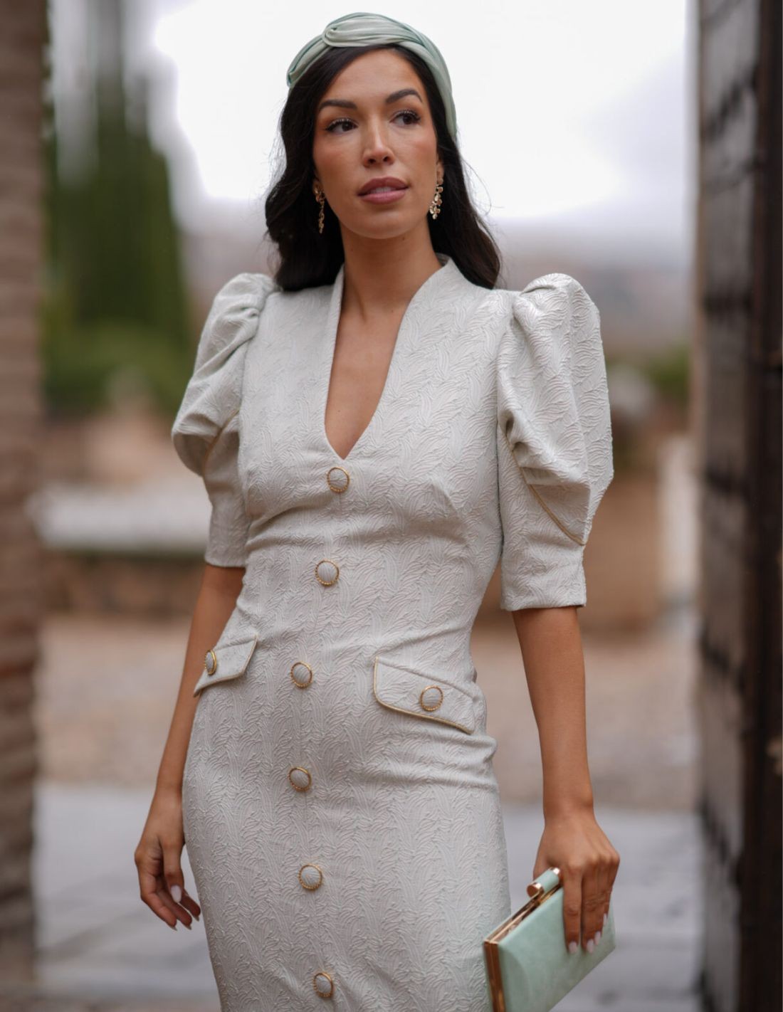 Un modèle très spécial pour une invitée printanière. Cette robe midi en tissu jacquard à manches ballon sera votre alliée pour briller cette saison ! Elle présente une encolure en V et des boutons sur le devant. Elle est idéale pour une maman pour une communion, un baptême ou une invitée de jour. Très élégante et sophistiquée, elle fera de vous l'invitée parfaite.