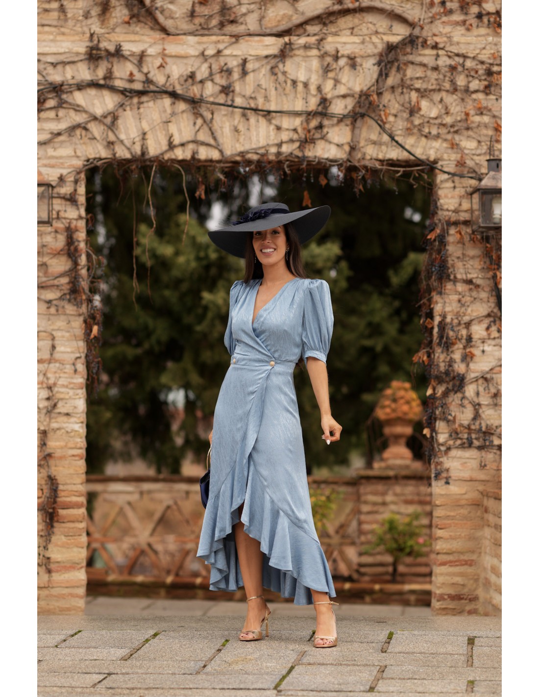 Un modèle spécial qui fera fureur ce printemps. Cette robe midi vous fera briller si vous êtes une mère de communion, de baptême ou une invitée d'un jour. Réalisée en tissu jacquard, fluide et avec beaucoup de tombé, elle est de couleur bleu clair. Elle présente un décolleté en V et des manches courtes bouffantes, ainsi qu'un motif croisé boutonné. Son ourlet asymétrique à volants ajoute à la féminité et au confort. Un modèle très spécial qui fera de vous une invitée parfaite.