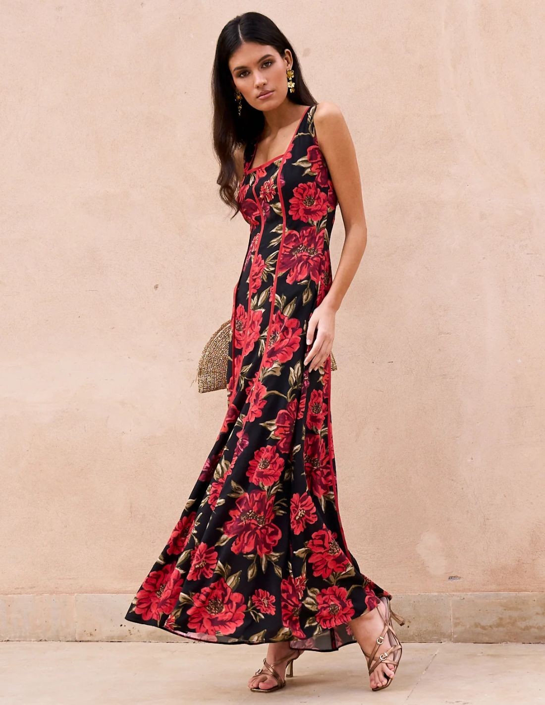 Cette robe midi pour invités, réalisée sur une base noire, se distingue par son imprimé floral dans les tons rouge et marron qui parcourt tout le vêtement, apportant une esthétique sophistiquée avec un air classique. Le haut est défini par une encolure carrée, encadrée par de larges bretelles qui apportent une structure ferme. L'élément technique le plus distinctif de ce modèle est le liseré vertical rouge contrastant.