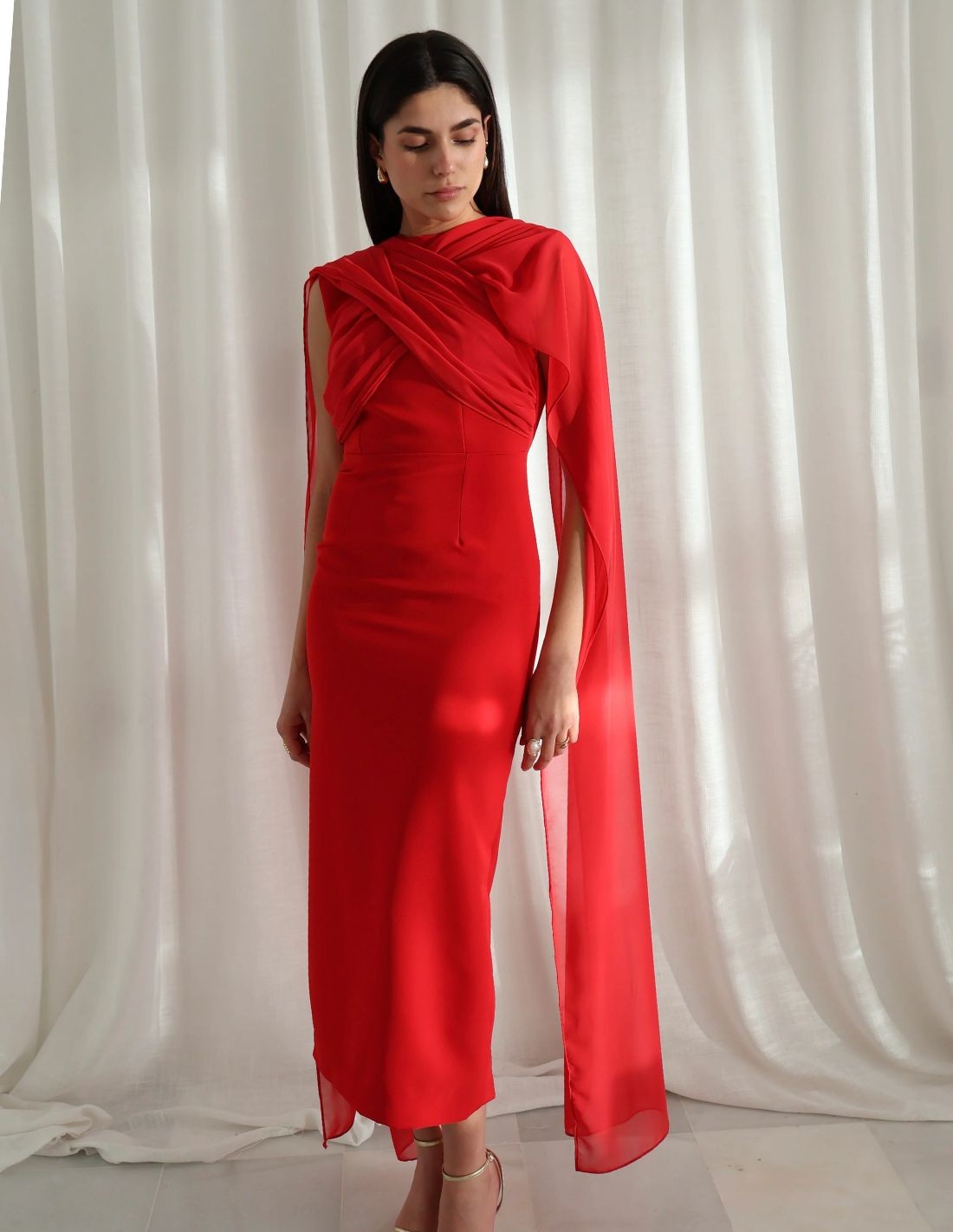 Robe midi rouge en crêpe et mousseline de soie croisée pour l'invitée