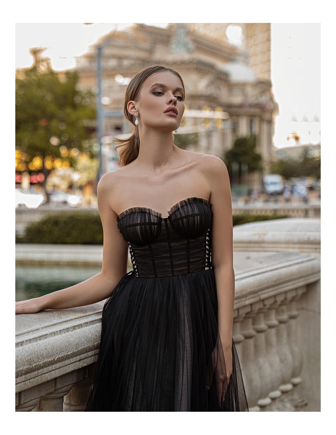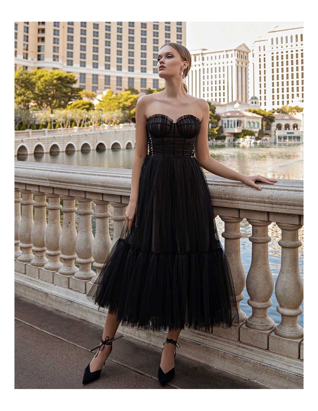 Magnifiquerobe de soirée midi en tulle à encolure cache-coeur avec décolleté et corsage sans bretelles.