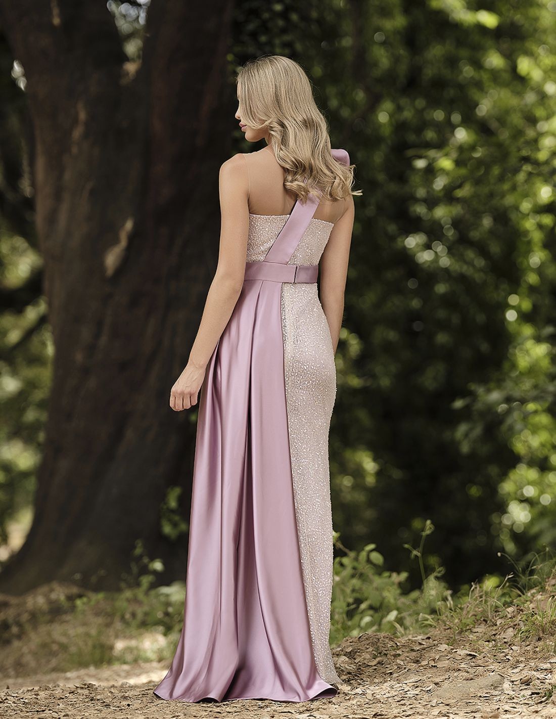 Robe longue de fête avec paillettes et surjupe en satin