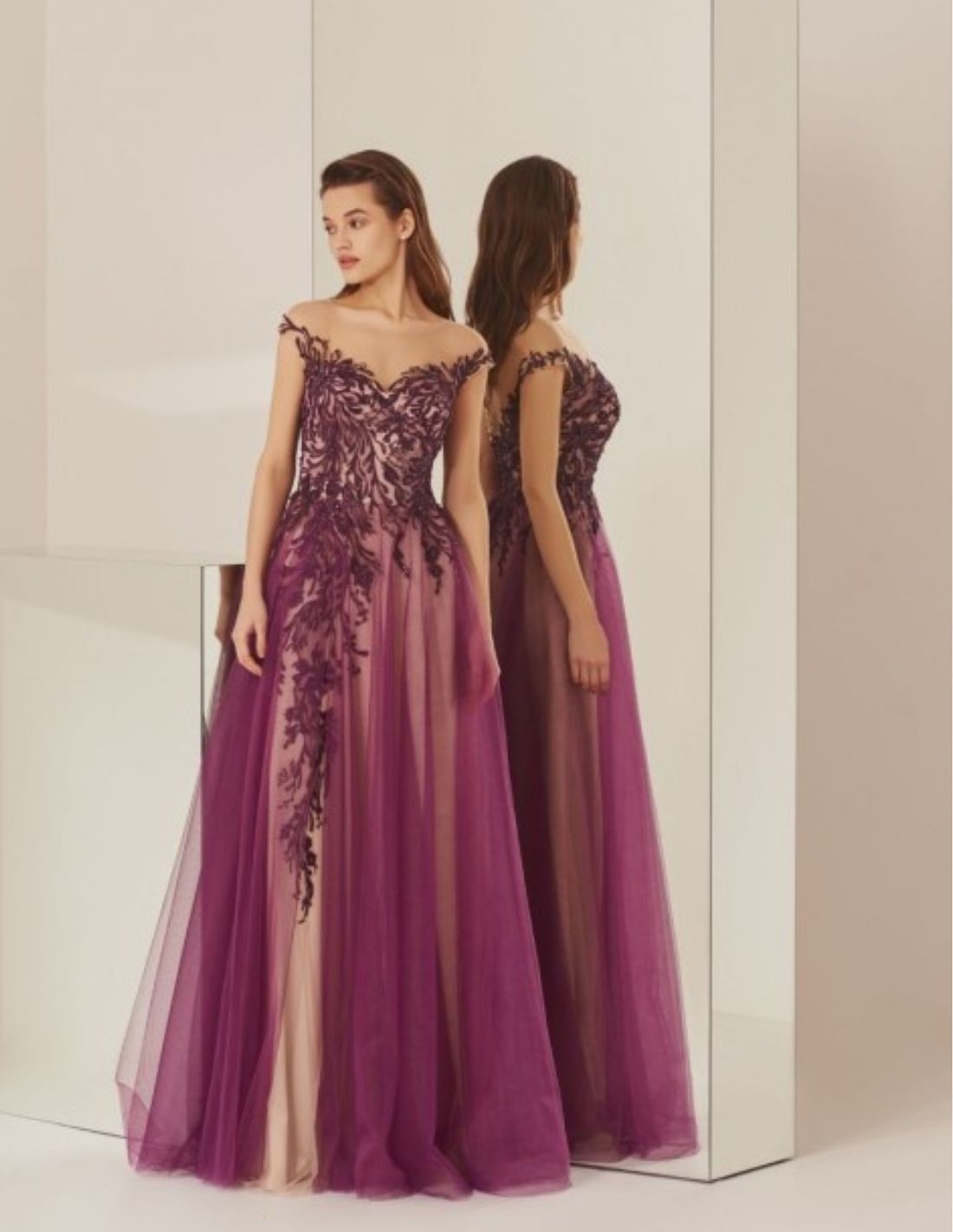 Robe longue de fête aubergine avec des couches de tulle pour les événements spéciaux.