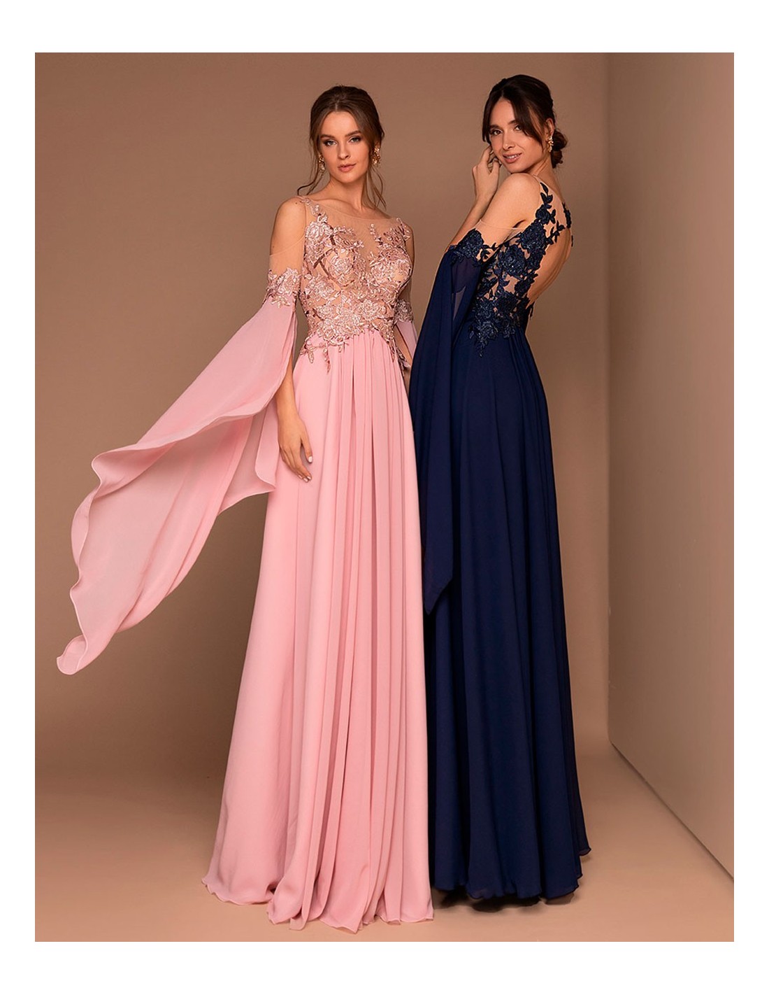 La robe de soirée est décorée d'éléments de guipure et de sequins. Disponible en trois couleurs : rose, bleu marine et noir avec champagne.