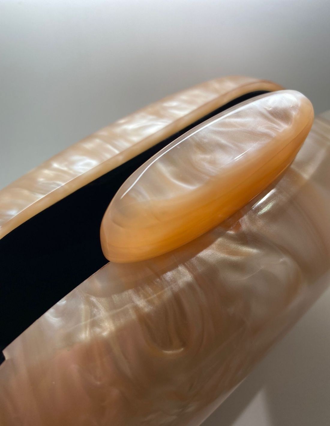 Ce sac à main pour invités est fabriqué à la main en PVC pêche. Il a une forme ovale très élégante, une fermeture aimantée pour plus de sécurité et une chaîne dorée à l'intérieur pour le porter à l'épaule.