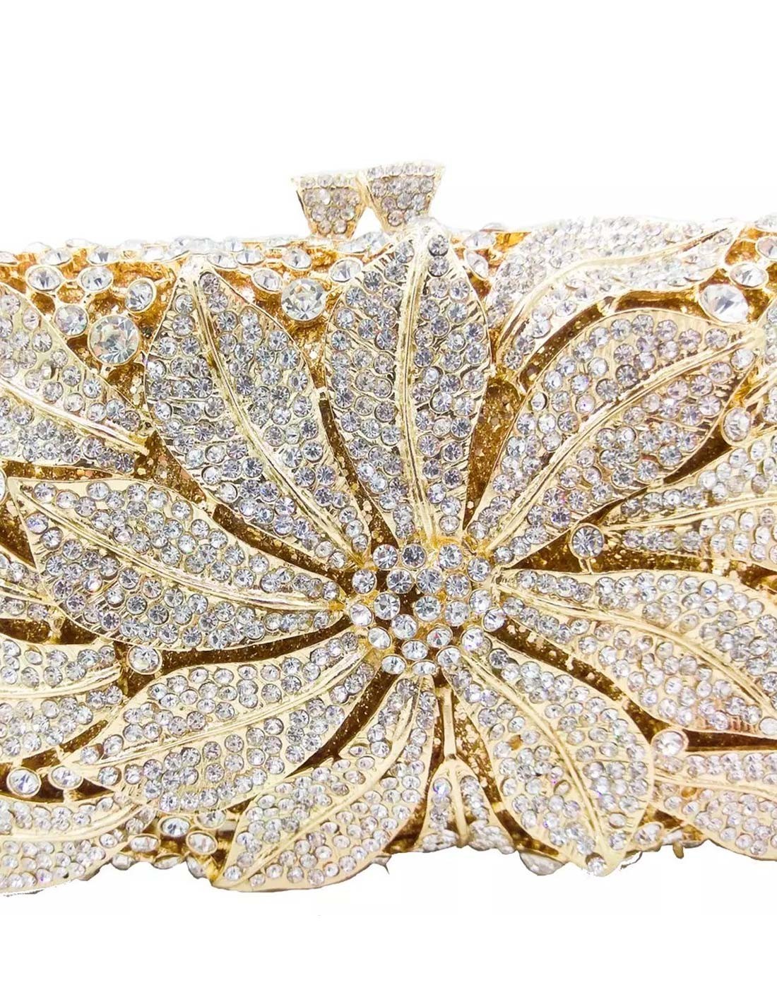 Sac à main bijoutier avec fleur centrale en métal et cristal - rectangulaire