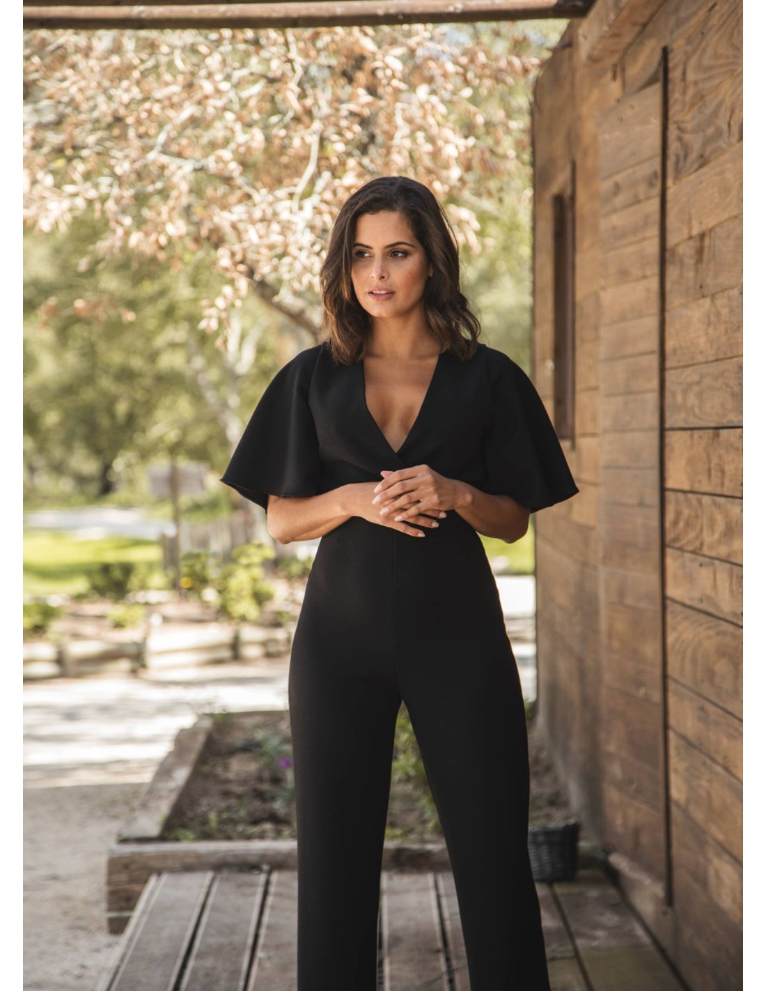 Éblouissez lors de votre prochain événement avec cette élégante combinaison noire, idéale pour les invités. Son encolure croisée plongeante et ses manches courtes fluides ajoutent de la sophistication, tandis que son dos ouvert apporte une touche sensuelle et exclusive.