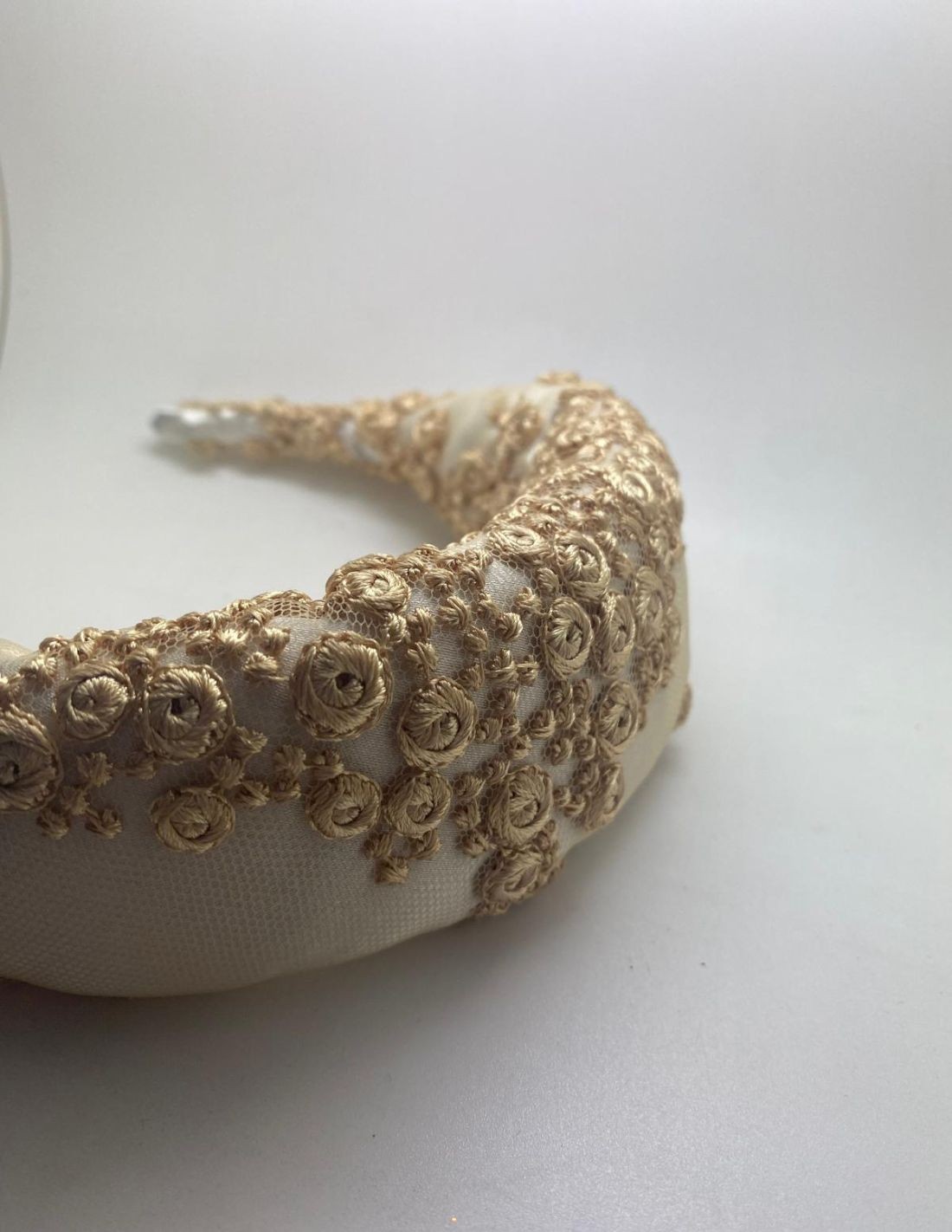 Serre-tête de mariée en tissu brut matelassé avec broderie dorée