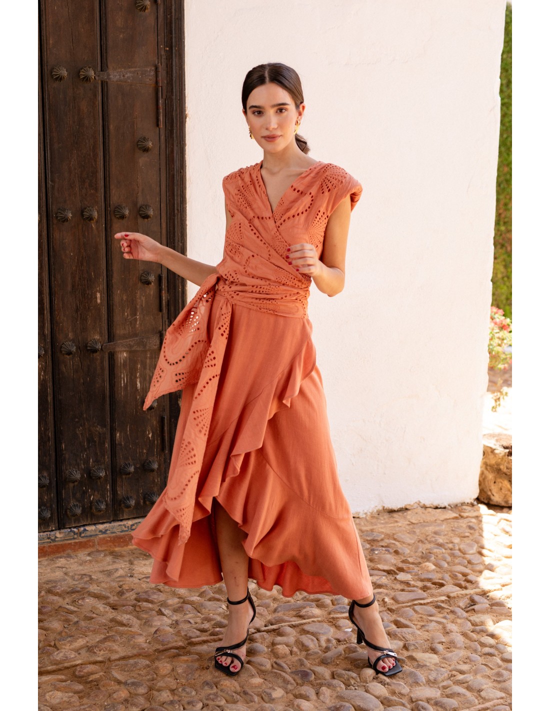 La jupe assortie, dotée d'un volant enveloppant, ajoute du mouvement et de la légèreté au look, idéal pour les journées chaudes. Le ton roux, chaud et flatteur, ajoute une touche de sophistication et de naturel. C'est le choix idéal pour les vacances, les dîners d'été, les événements décontractés ou les escapades élégantes.