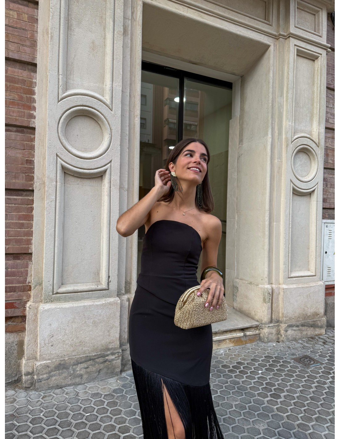 Ensemble noir avec haut asymétrique à bretelles et jupe à franges