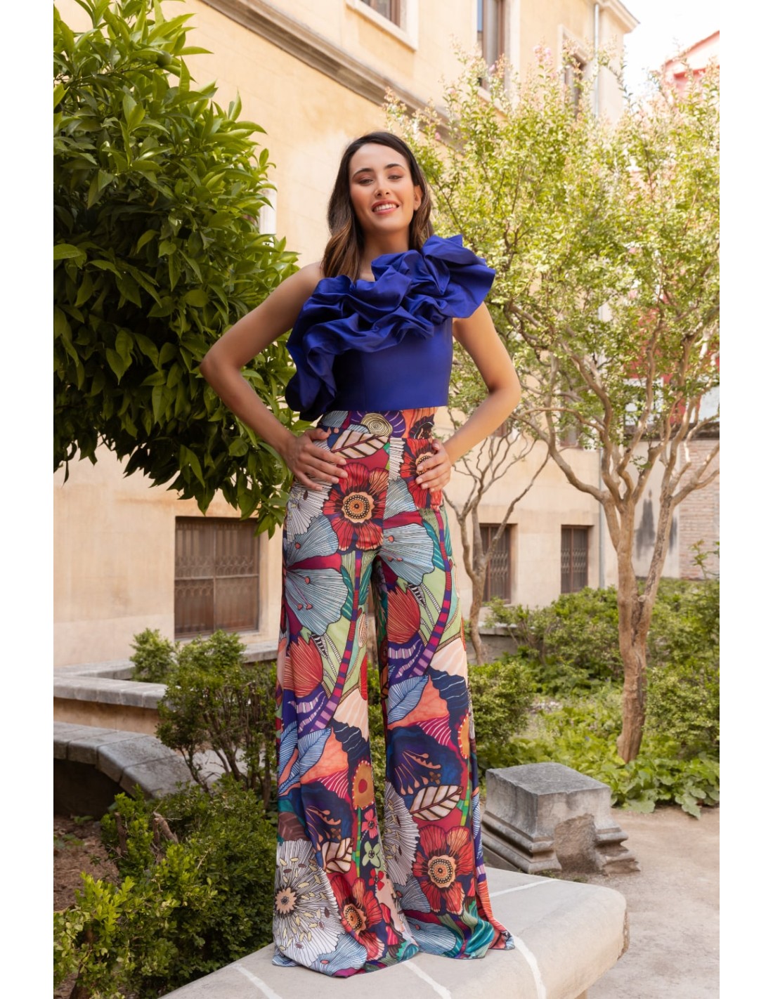 Cette tenue de fête sera votre meilleure alliée si vous êtes de celles qui misent sur un deux-pièces pour tout type d'événement. Un ensemble composé d'un pantalon large en tissu imprimé et d'un top bleu à encolure asymétrique et maxi volants sur l'encolure. Si vous êtes de celles qui veulent se démarquer dans toutes les occasions spéciales, c'est la tenue qu'il vous faut.