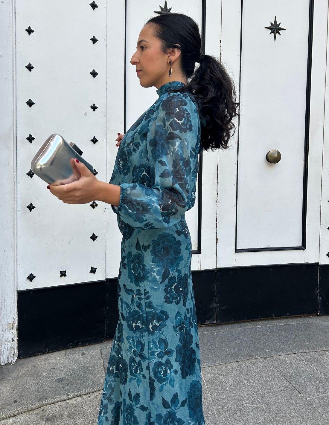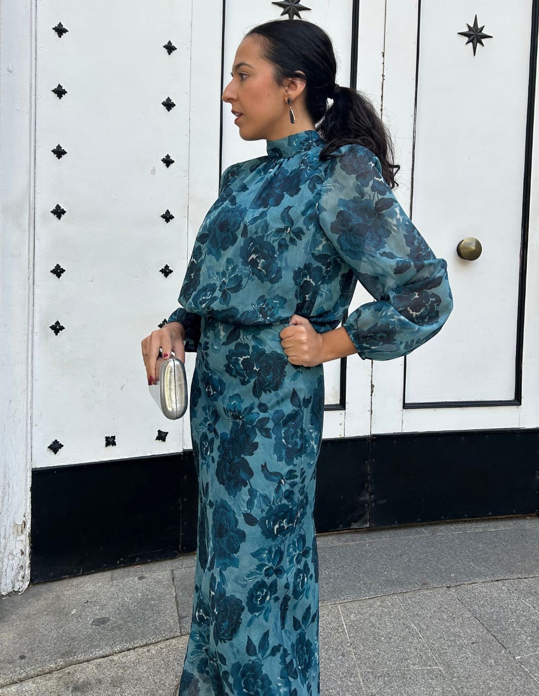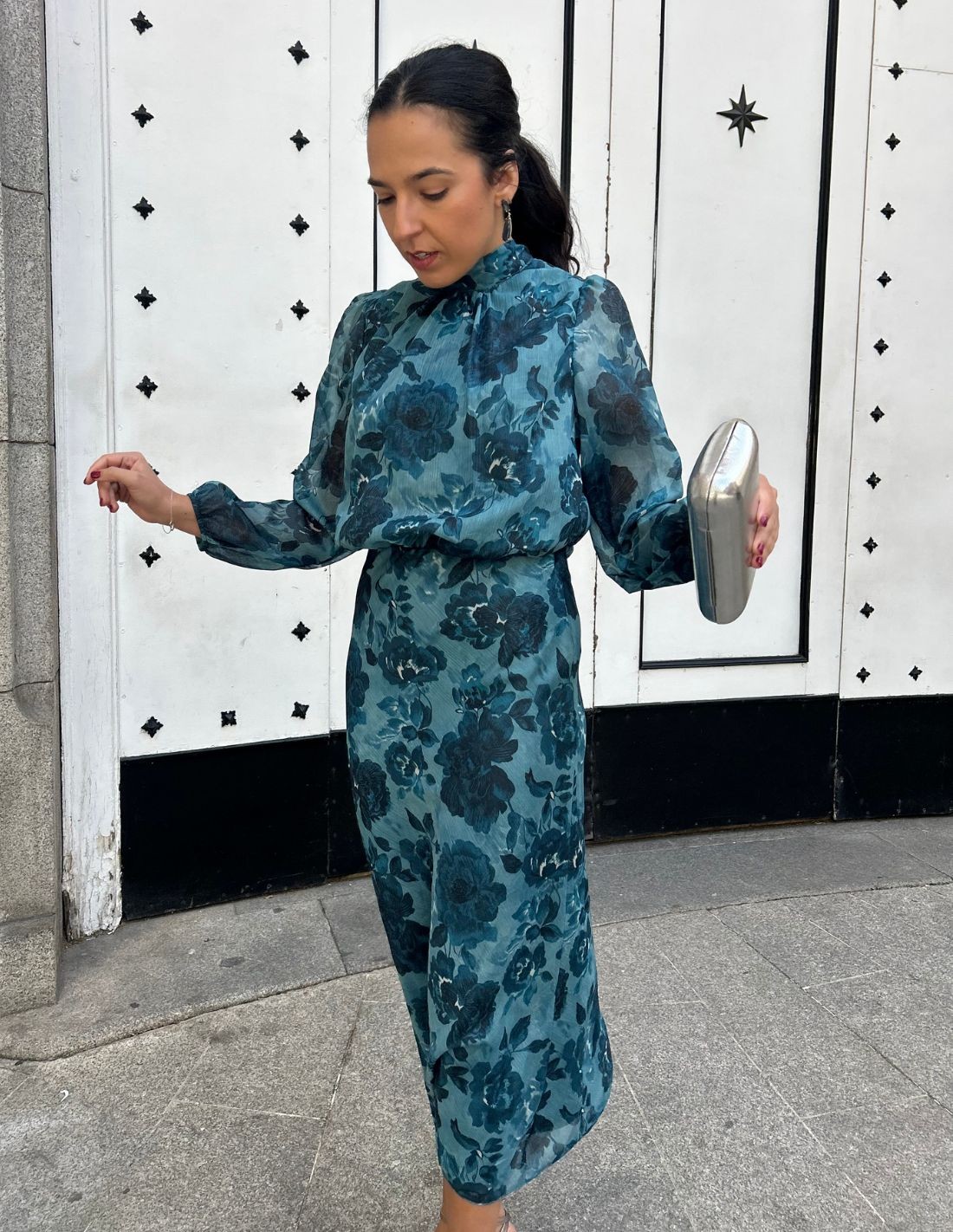 Un look parfait qui fera de vous l'invitée idéale lors de votre prochain événement de la saison. Si vous êtes une invitée d'automne, cette tenue vous fera briller. Composée d'un top à manches longues, encolure fermée et laçage au dos et d'une jupe midi avec élastique à la taille qui permet un confort total. Ce modèle a été réalisé dans une mousseline de soie imprimée de paillettes bleues et de fleurs. Parfait pour toutes sortes d'événements : mariages, remises de diplômes, communion ou baptême.