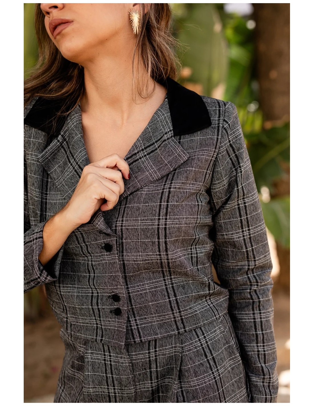 cette veste courte deviendra votre préférée ! Un vêtement qui ne passera pas inaperçu, réalisé dans un tissu à carreaux gris et noirs et avec des cols en velours noir. Si vous voulez l'ensemble complet, vous pouvez le combiner avec le pantalon dans le même tissu et le même imprimé et vous aurez une veste de costume idéale pour tout événement ou même pour des tenues de tous les jours, vous ne voudrez plus l'enlever !