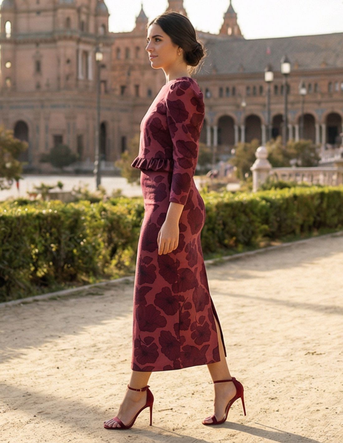 Le haut présente des manches longues avec un léger volume aux épaules et un volant au bas qui donne du mouvement et définit la silhouette. Les boutons dans le dos ajoutent un détail spécial qui complète le modèle avec une touche féminine et soignée. La jupe midi, de coupe droite, affine la silhouette et équilibre la tenue, la rendant à la fois confortable et élégante.