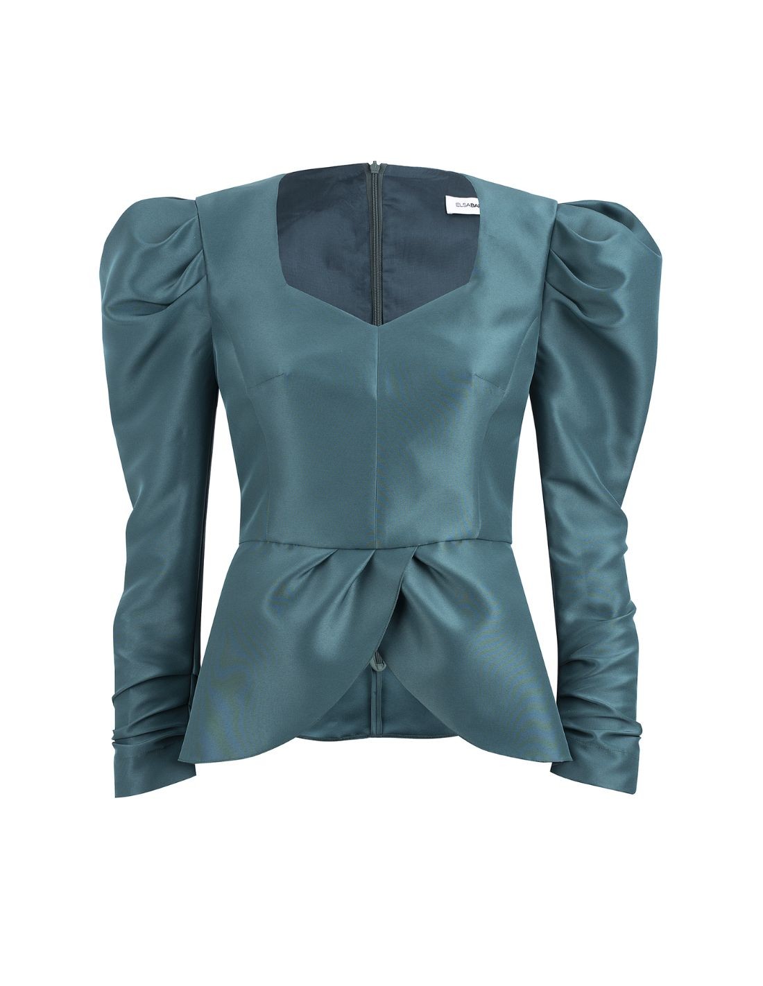 Élégante blouse d'invité dans un taffetas vert émeraude flatteur. Elle présente une encolure carrée avec un décolleté en cœur, de longues manches bouffantes avec une épaule prononcée, des poignets froncés et un ourlet drapé à volants.