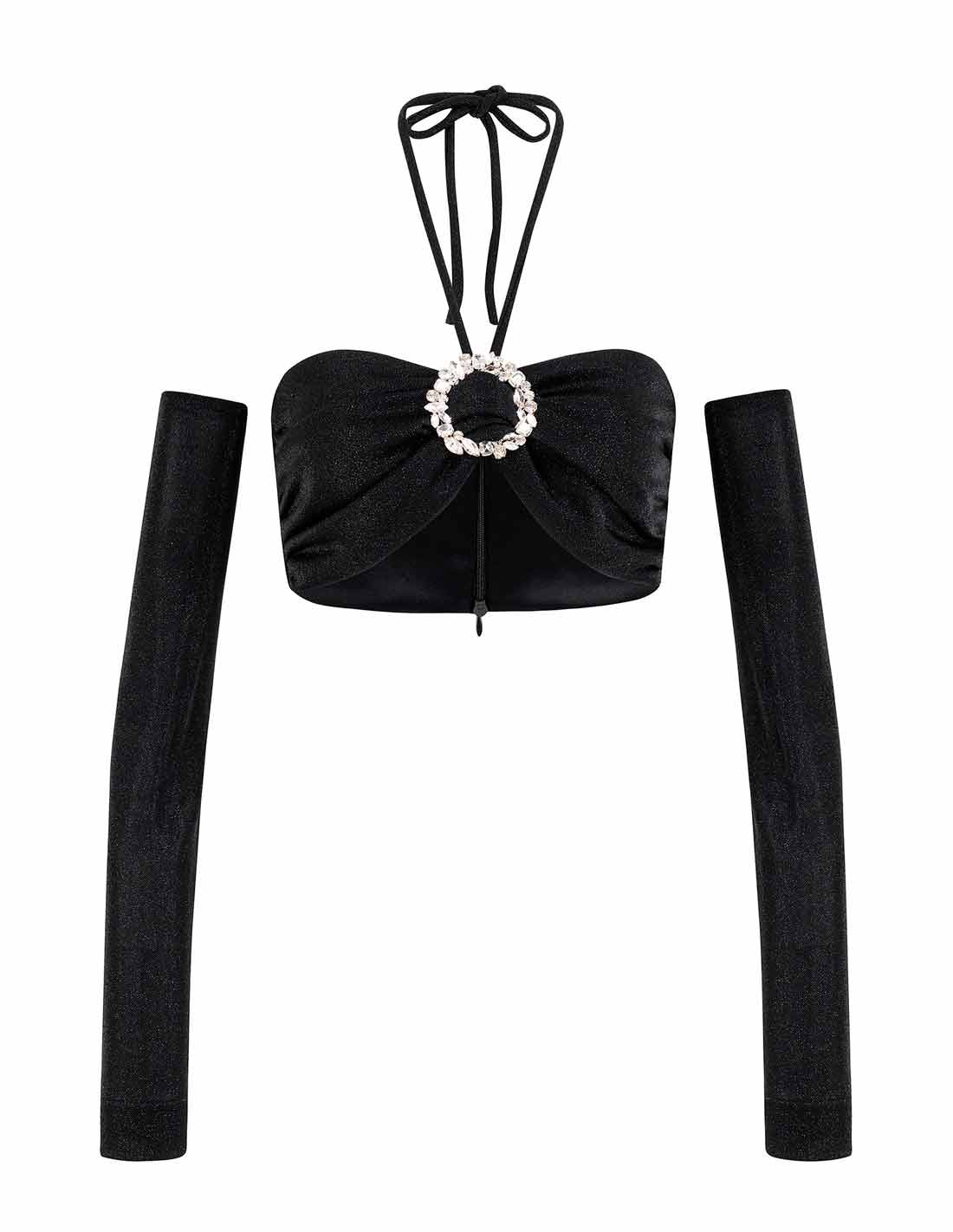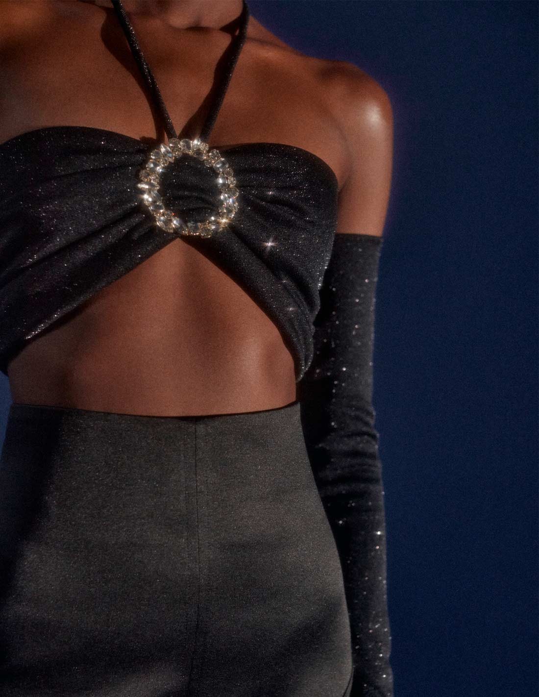 La pièce la plus idéale de la collection pour briller à chaque fête. Un crop top en maille brillante, avec des manches amovibles dans la même matière. Un top bandeau revisité grâce à la pièce centrale en forme de bijou qui rendra votre look beaucoup plus sexy et sophistiqué. Il est également doté de bretelles attachées au cou que vous pouvez ajuster à votre guise. Il se ferme au dos par un zip invisible.