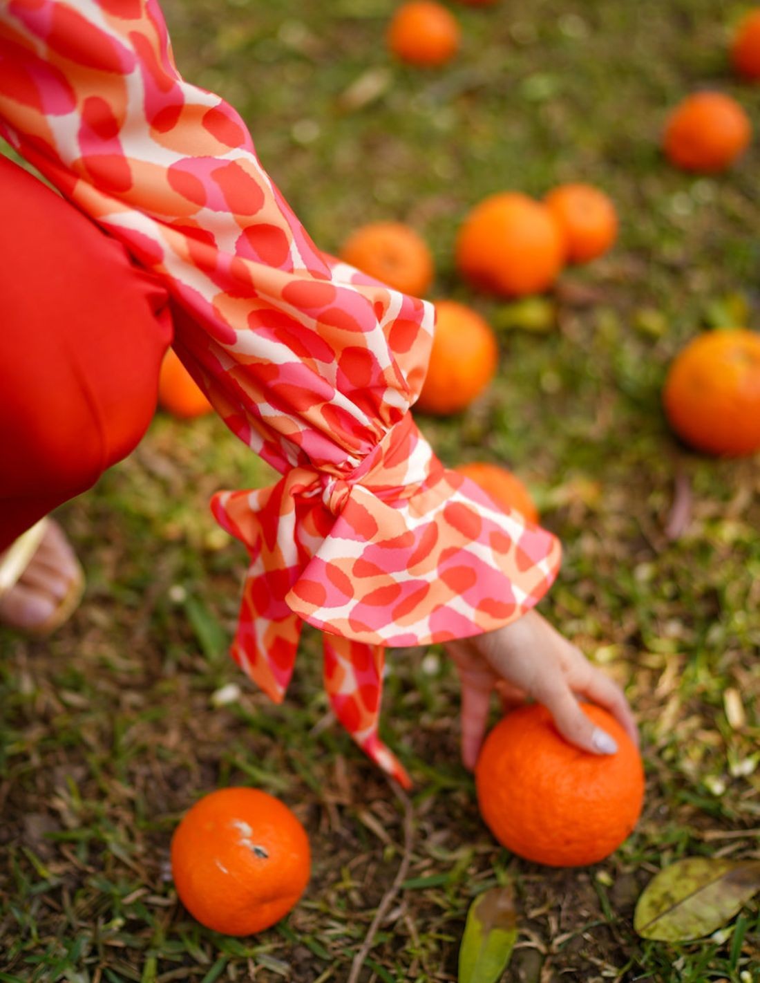 Ce chemisier de fête comporte un imprimé frappant et coloré dans les tons orange, rouge et blanc, formant une combinaison de couleurs parfaite pour la saison printemps-été. Il s'agit d'un modèle très spécial avec des manches longues, une encolure à volants et une fente dans le dos.